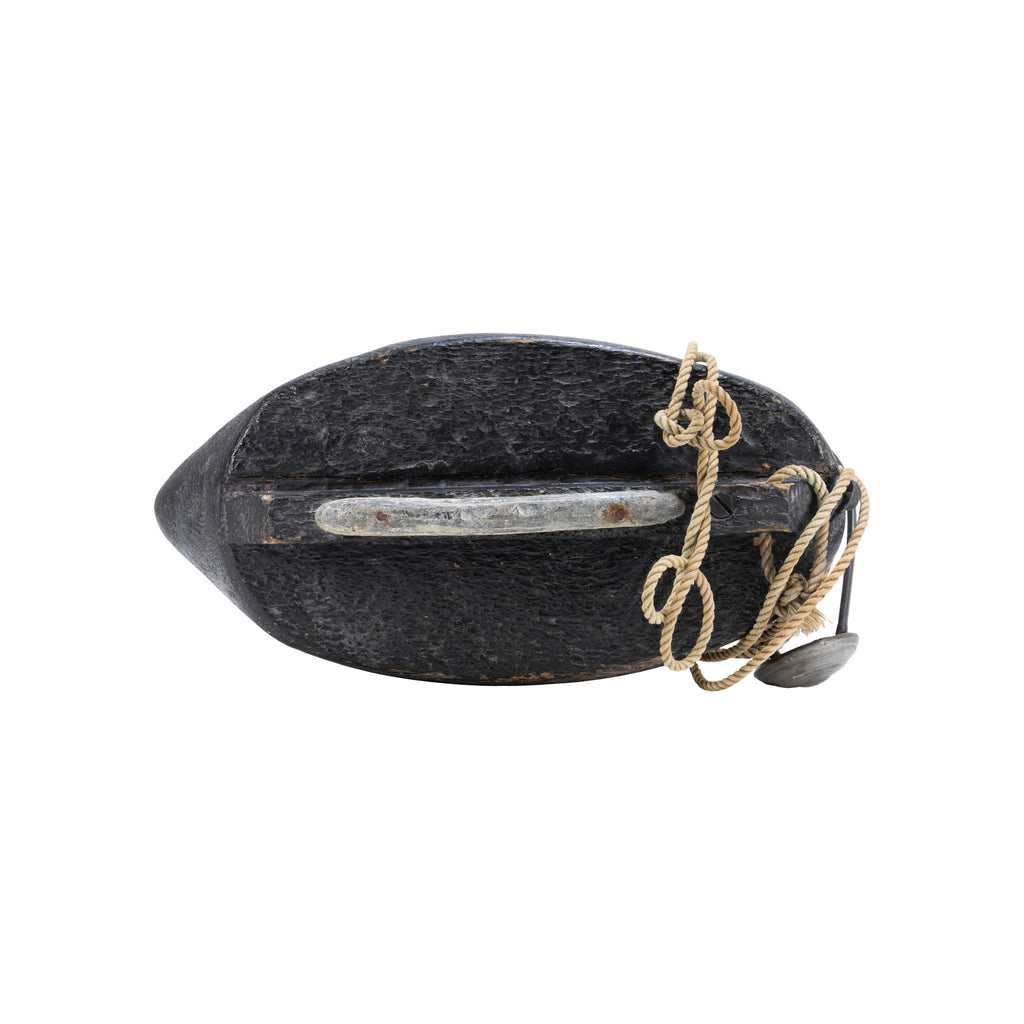 Coot decoy carved by Pat Farrel. Glass eyes, brass tack on beak and carved wings.