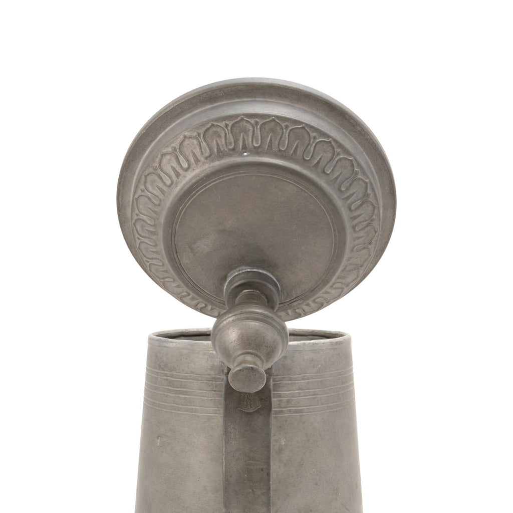 Classic pewter stein with simple vine decoration around text. Body and bottom marked "DA, 1821". As a result of the bubonic plaque and several invasions of flies throughout Europe, Germany established several laws in the early 16th century requiring all food and beverage containers be covered. By combining a lid, hinge, and thumb lift, these "German" containers could easily be opened and closed with one hand. Steins became very popular, and many different types of designs and decorations were artistically applied to them. Many stein-decorating styles and techniques were developed over the centuries, offering further diversity to this creative, historical, artistic, and ever-evolving gift item.