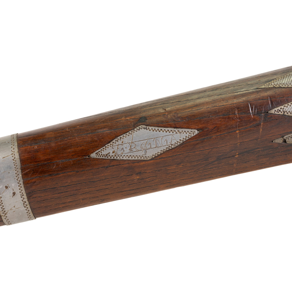 Heavily adorned presentation grade pipe tomahawk with pewter inlaid fish, moon, acorn and war axe on cast iron blade.