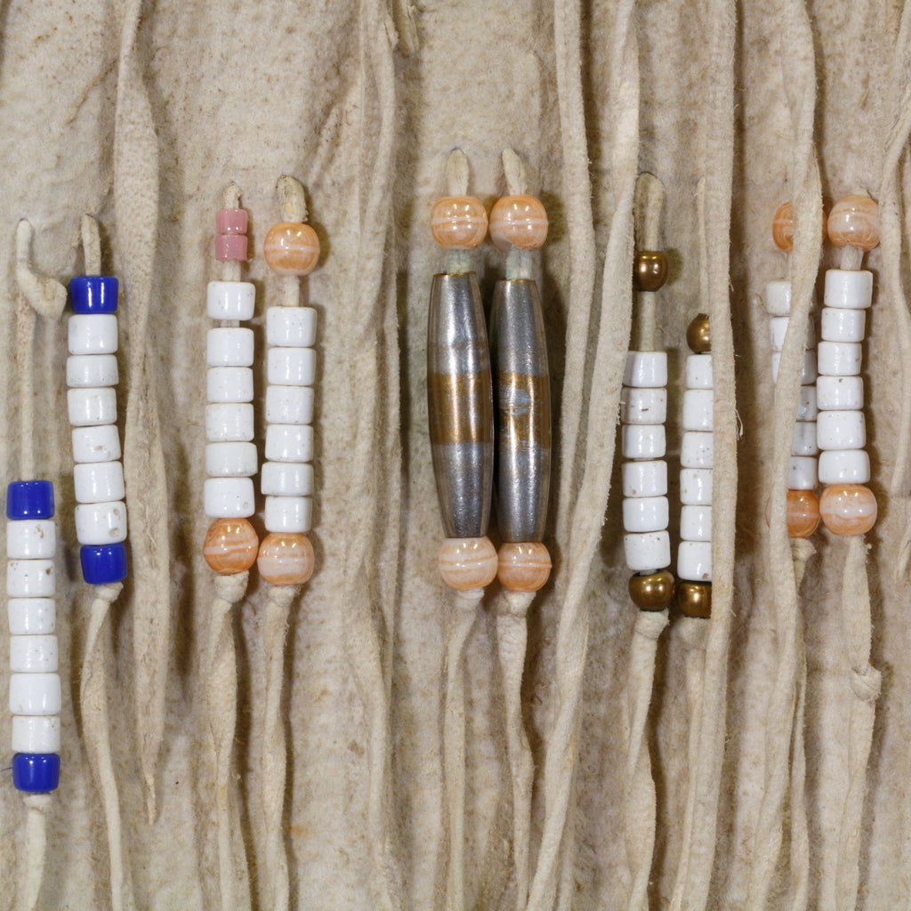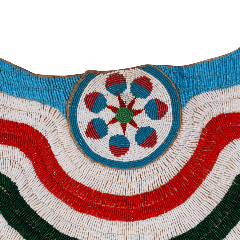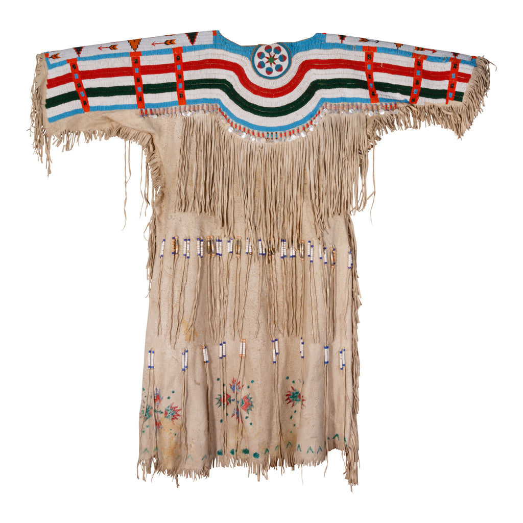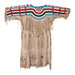 Beautiful brain tanned elk hide dress. The yoke with underlying rows of larger red, white, green and blue beads. Shoulder stirps lazy stitched with 20/0 cut seed beads and containing arrows with other geometrics. Rose and painted florals near hem.