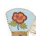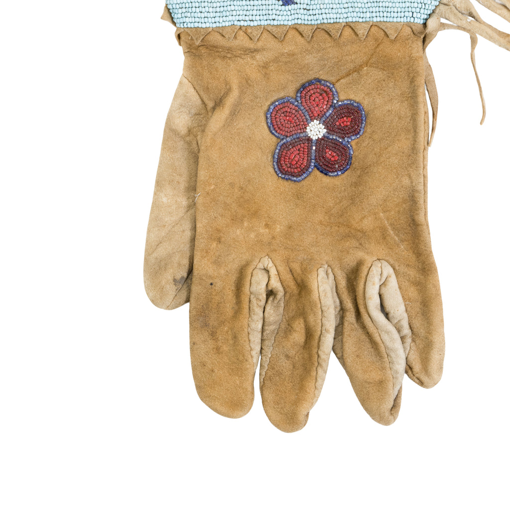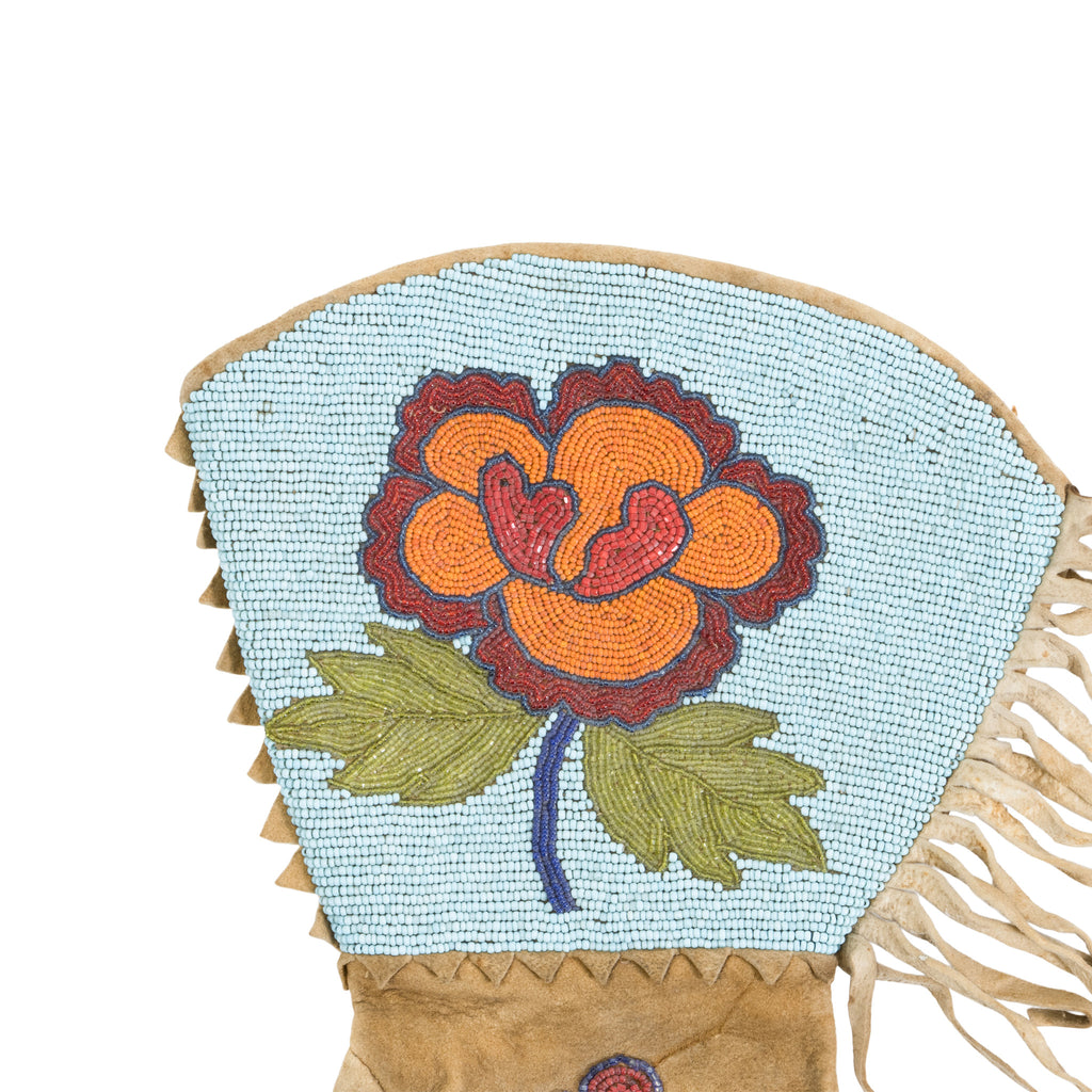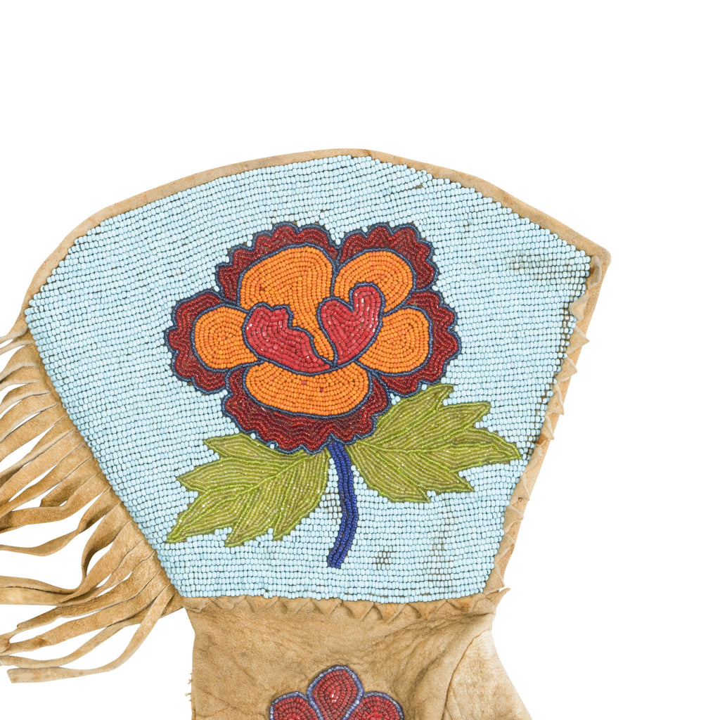 Plateau floral beaded gauntlets. An adult sized pair of vintage beaded gauntlets with a multi-colored flower design on a light blue field. Fringed sides on heavy elk hide gloves. Cuffs are 8 1/2" wide and the glove is 14" overall from top to bottom. A beaded flower also decorates the top of the hand.