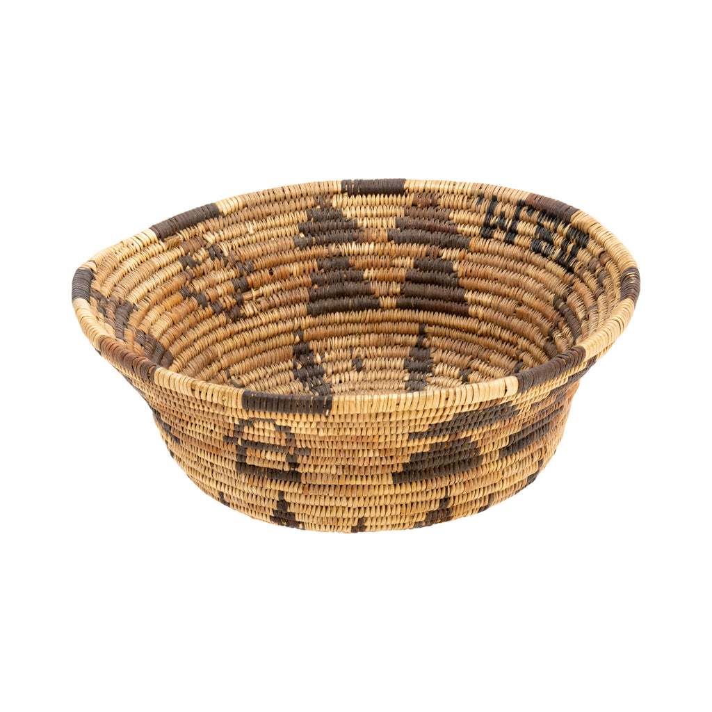 Polychrome flared finely woven Pomo basket with geometric designs. The background material is sedge and the design material is dyed bull rush root. Collectors inked initials DSM on inside rim. Initials are from Daisy Maccallum of Crescent City, CA. She had significant collection mostly from local Pomo people in the area or working for her husband Alex in a lumber mill in the area. Most of her baskets are now in the California State Native Heritage Museum though a few have appeared for sale. Another is in the collection of the Grace Hudson Museum in Ukiah, CA. 5" x 2" Under the name Pomo are some 30 small tribes. The tribes which made these baskets live in Lake Sonoma and Mendocino counties, and are examples of their best work. The materials used are California sedge, nut pine, black rooted sedge, Sitka willow, Douglass spruce beaked hazel, California flax, red fir, poison oak, bracken, bullrush, nutmeg, Oregon grape, syringa, maiden-hair fern, digger pine, green briar, willow, redbud, bracken, calycanthus and hazelnut.