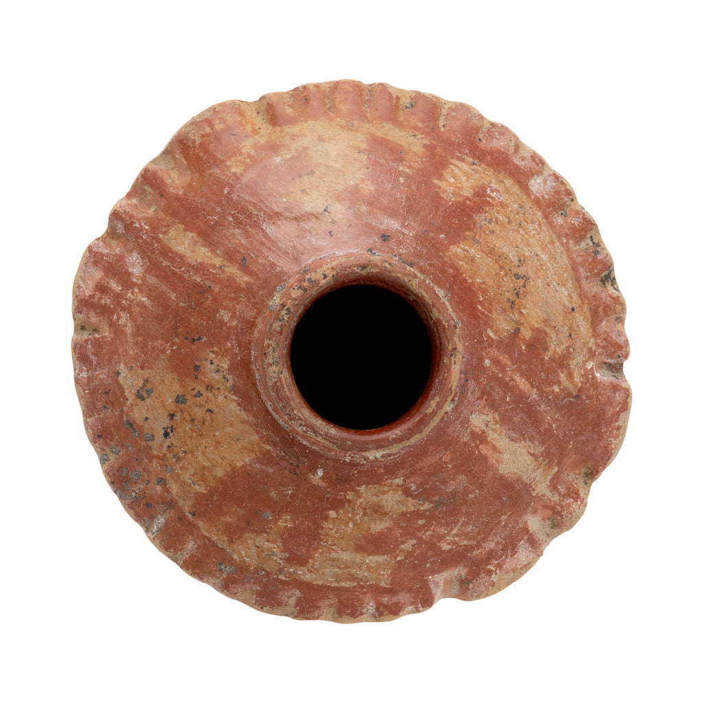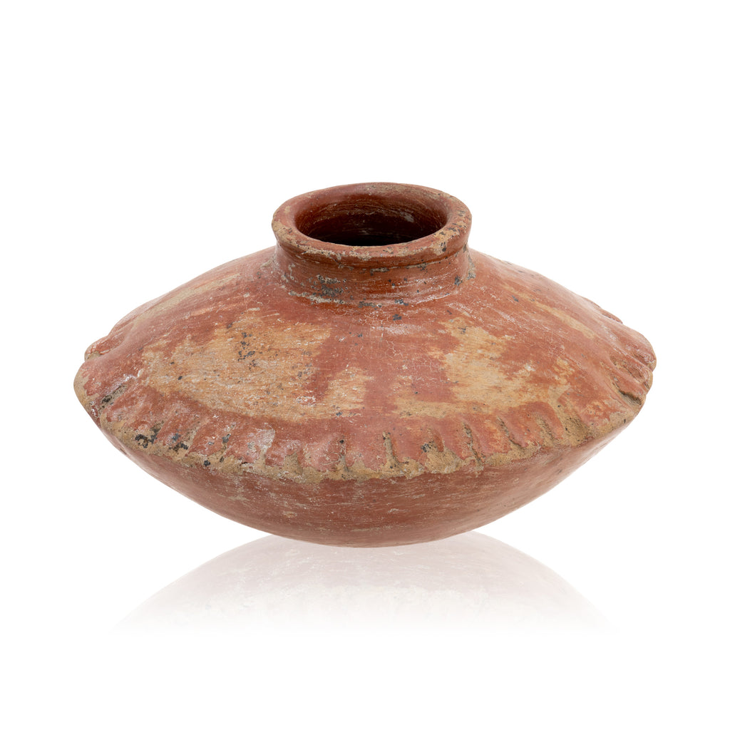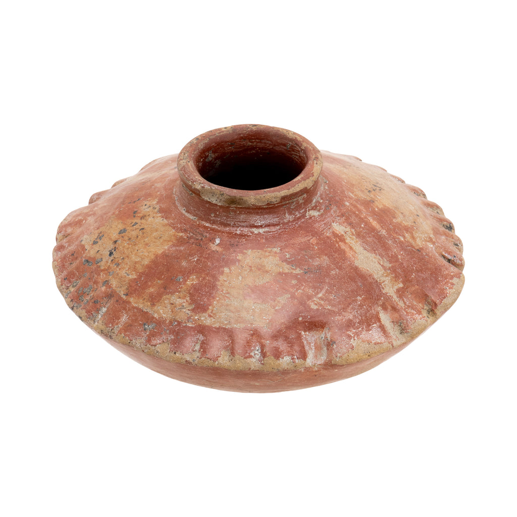 Pre-Columbian Colima Red Ware Cauldron. Colima pottery Red Ware cauldron with fluted edge. Colima culture dating between 300 BC and 300 CE. 4 ½” x 3”. Ex. Hank Johnson Collection. Hank Johnson was a geologist, and passionate collector of historical and ancient artifacts. Starting with relics and bottles from ghost towns, he later focused on Anasazi pottery and Pre-Columbian. He worked with the Denver Art Museum to verify authenticity, building a respected reputation in the collecting community. View the entire Hank Johnson Collection under Special Collections “Johnson.”