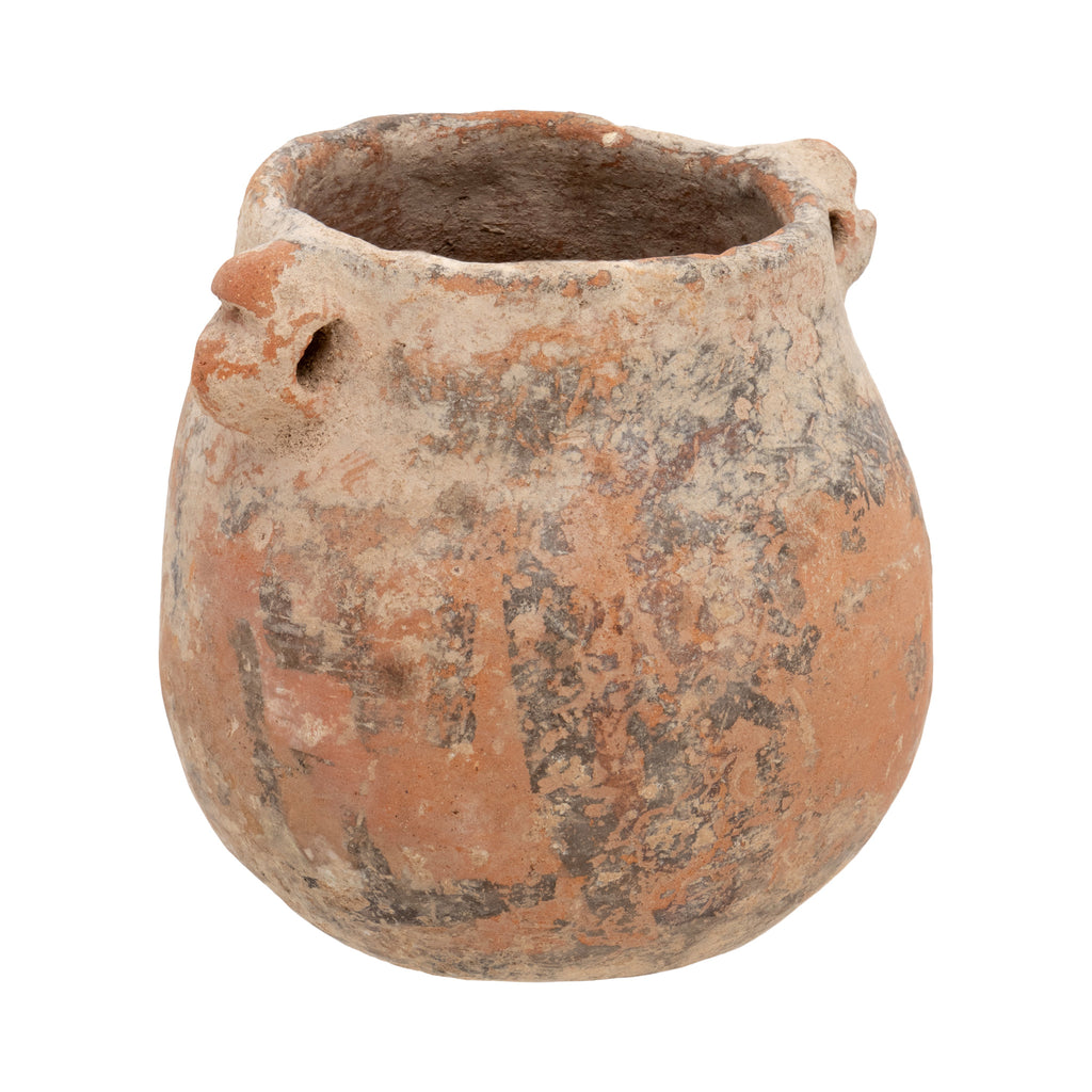 Pre-Columbian pottery jar with strap holes for handles. Once had a black painted design. 3 ½”H x 3 1/2". Ex. Hank Johnson Collection. Hank Johnson was a geologist, and passionate collector of historical and ancient artifacts. Starting with relics and bottles from ghost towns, he later focused on Anasazi pottery and Pre-Columbian. He worked with the Denver Art Museum to verify authenticity, building a respected reputation in the collecting community. View the entire Hank Johnson Collection under Special Collections “Johnson.”