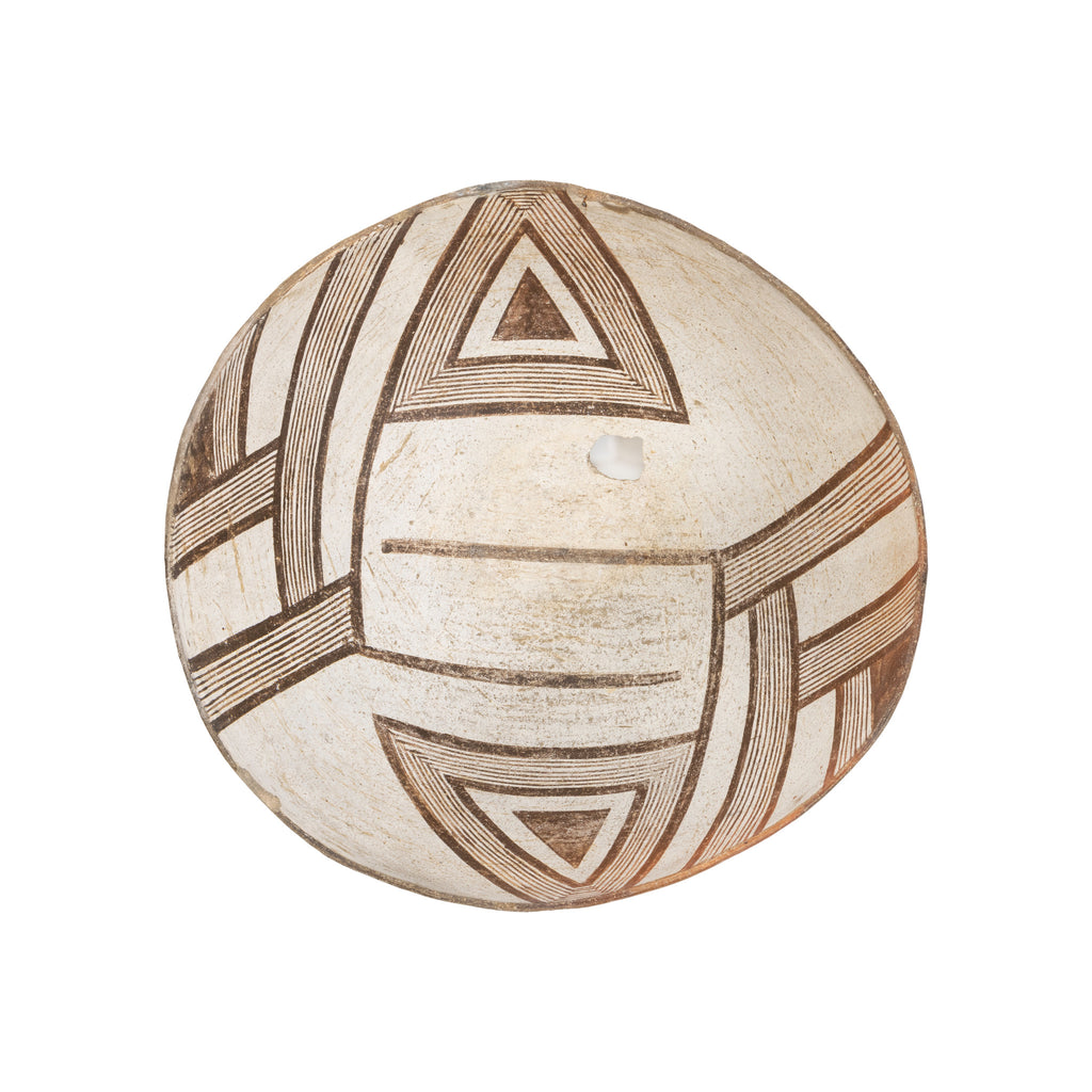 Prehistoric Anasazi Mimbres red on white pottery bowl with alternating solid and fine-line geometric motifs about the rim, restored. Ink collection number on the underside: 6721. Exhibited: Decoding Mimbres Painting: Ancient Ceramics of the American Southwest, Los Angeles County Museum of Art, Los Angeles, CA, May 20 - December 2, 2018. Illustrated: Berlant, Tony, and Mauer, Evan, Decoding Mimbres Painting: Ancient Ceramics of the American Southwest, Prestel Publishing, New York, in association with LACMA, 2018, p. 99, described as "Bowl with Abstraction of Datura Blossom and Leaves." In the chapter "Identifying Mimbres Artists" it is suggested by the authors that "Our close examination of Mimbres ceramics has led us to conclude that a very small number of master artists in each generation painted all the finest Mimbres bowls... Given the sophistication and variety of compositions, it is clear that Mimbres artists endeavored to devise original and unusual paintings that expressed individuality and dramatic invention." Ibid. p. 97. Based on criteria further discussed in that chapter, the authors have attributed the present lot as an example of the work of "The Morphing Flower Artist." Ex. ainbow Trader's Auction Service, Godfrey, IL, 29 May, 2013; Property from the Collection of Tony Berlant This item is guaranteed to be of the time period and condition as described, has been exported legally and is legal to buy and sell under all international laws relating to cultural patrimony.