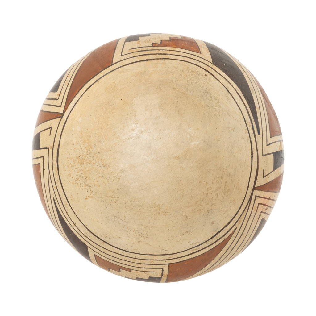 Prehistoric Casas Grandes pottery olla. Hand coiled and painted polychrome design. Ex. Barnard. 10" x 9 1/2". Casas Grandes (Spanish for Great Houses; also known as Paquime) is a prehistoric archaeological site in the northern Mexican state of Chihuahua. Casas Grandes (Paquime) is one of the largest and most complex Mogollon culture sites in the region. Settlement began after 1130 CE and would see the larger buildings developed into multi-storied dwellings after 1350 CE. The community was abandoned approximately 1450 CE. Casas Grandes is regarded as one of the most significant Mogollon archaeological zones in the northwestern Mexico region, linking it to other sites in Arizona and New Mexico in the United States, and exhibiting the expanse of the Mogollon sphere of influence. Ex. Barnard