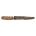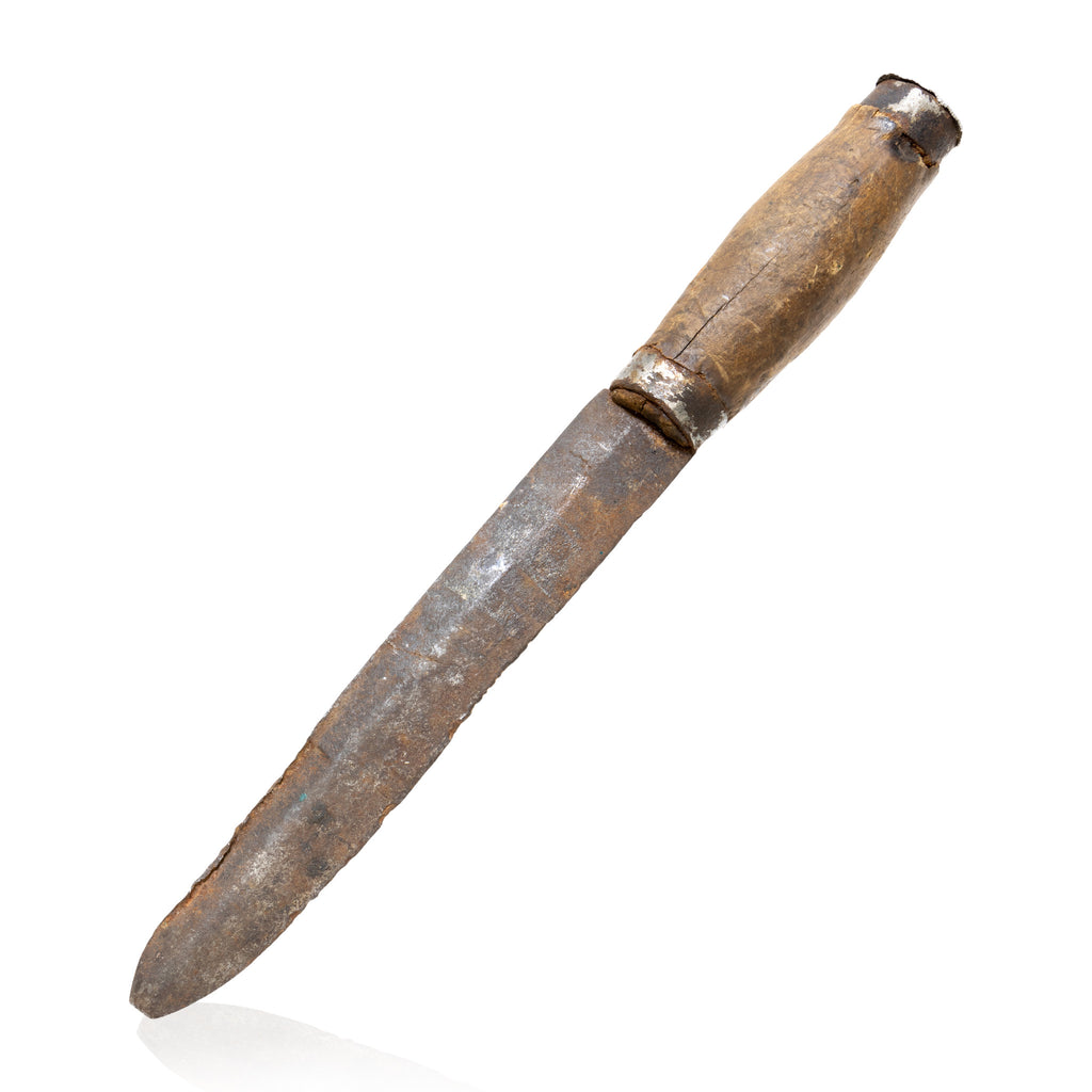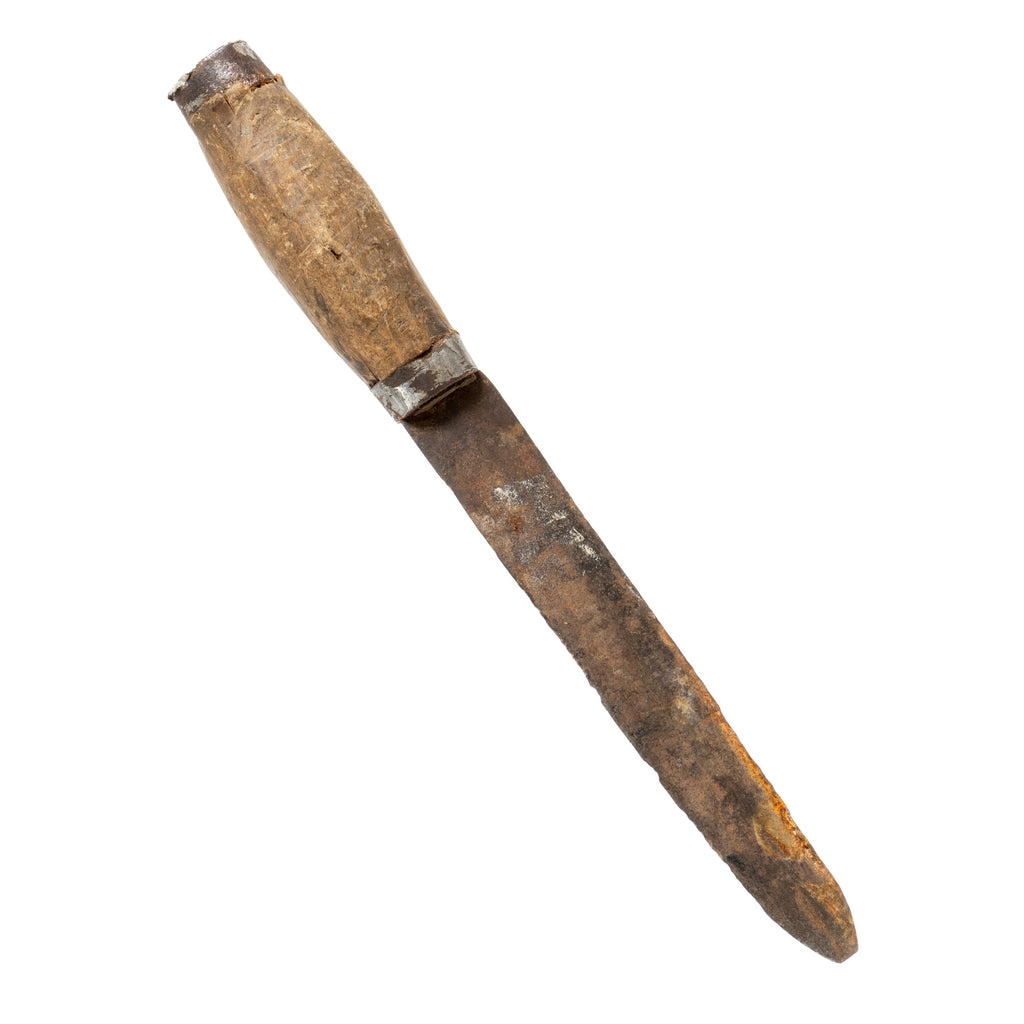 Primitive frontier knife with blacksmith pounded blade and hand carved wooden handle. Perhaps a fighting knife. Heavily used. Blade 6 1/2" overall 10 1/2