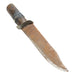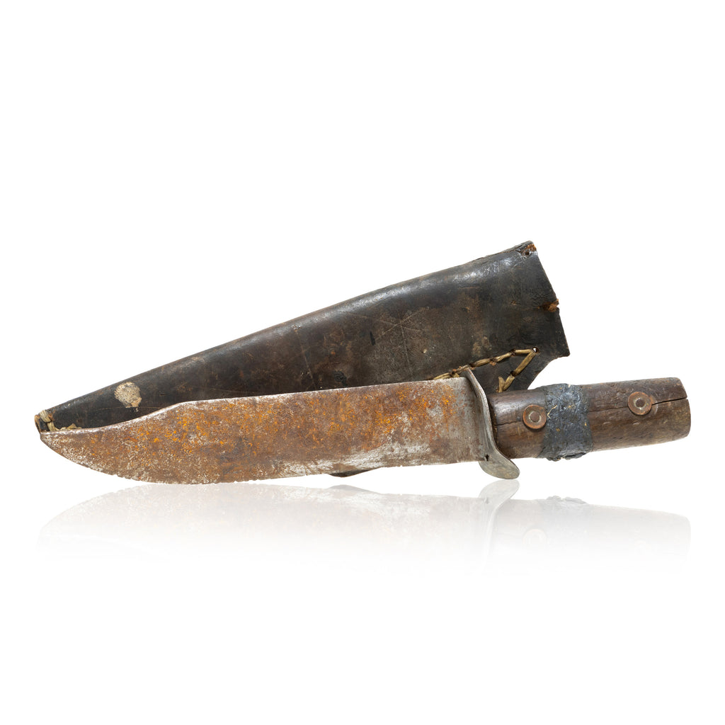 Primitive 19th Century skinning knife with sheath. Handle with copper rivets. Includes harness leather sheath. Wide blade. Blade 8" overall 12"
