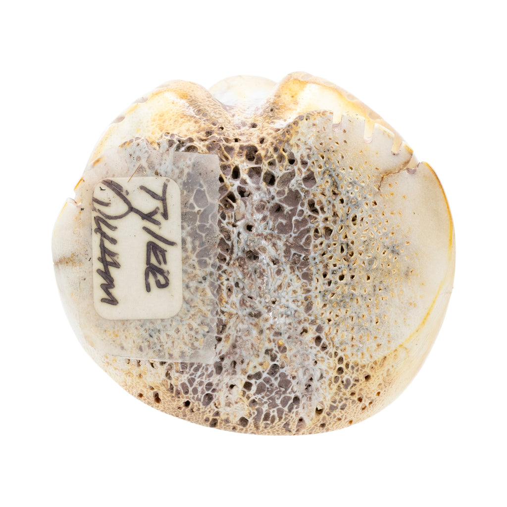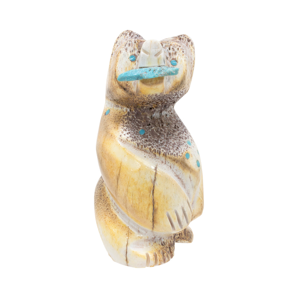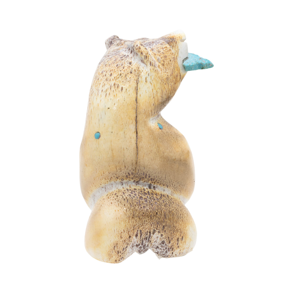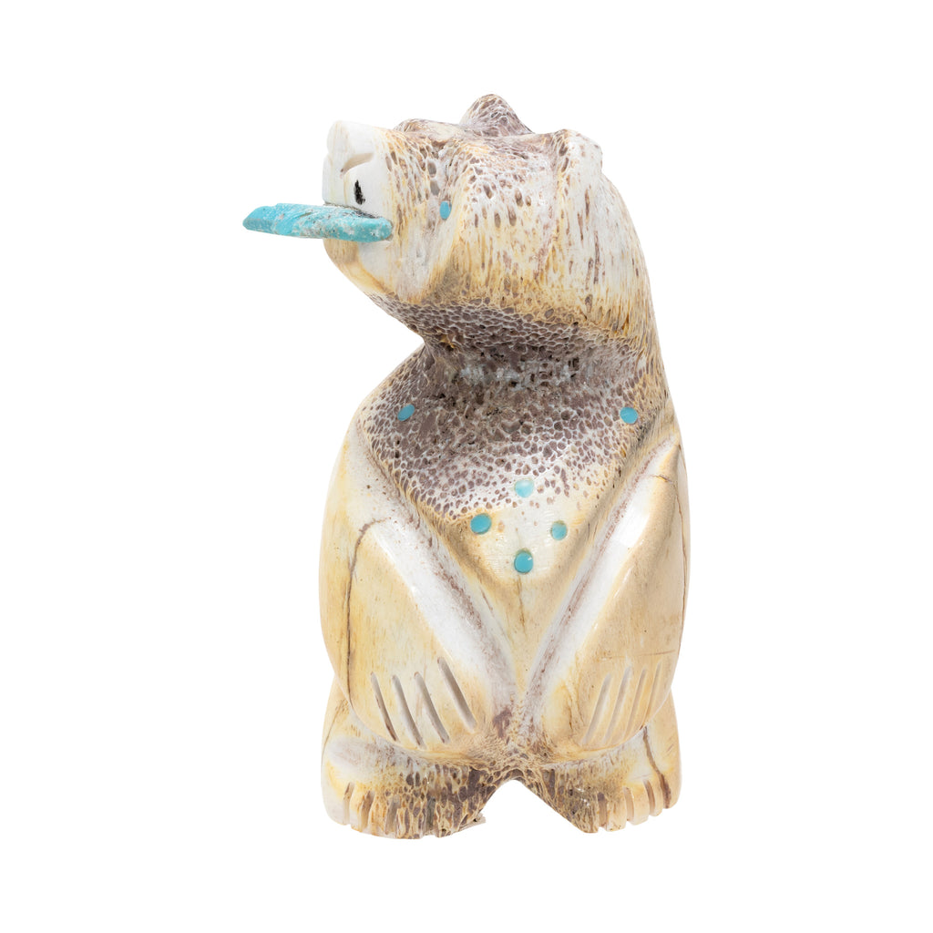 Pueblo carved fossilized bone fetish of standing bear with turquoise, fish in mouth, and turquoise bead accents. Bottom signed "Tyler Guam." 3"H