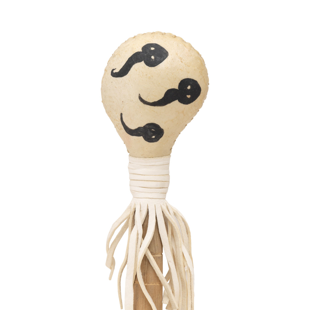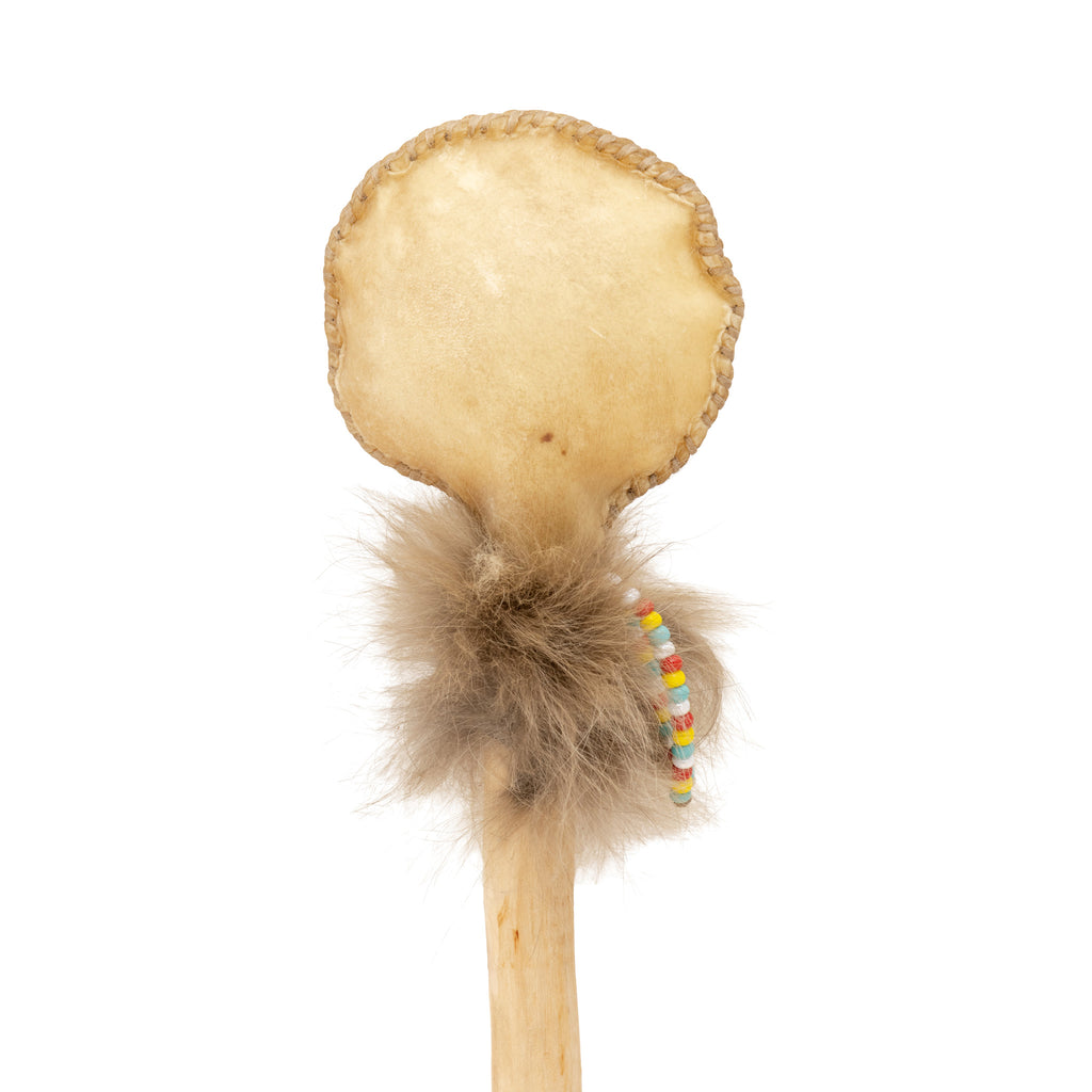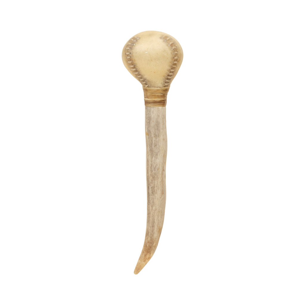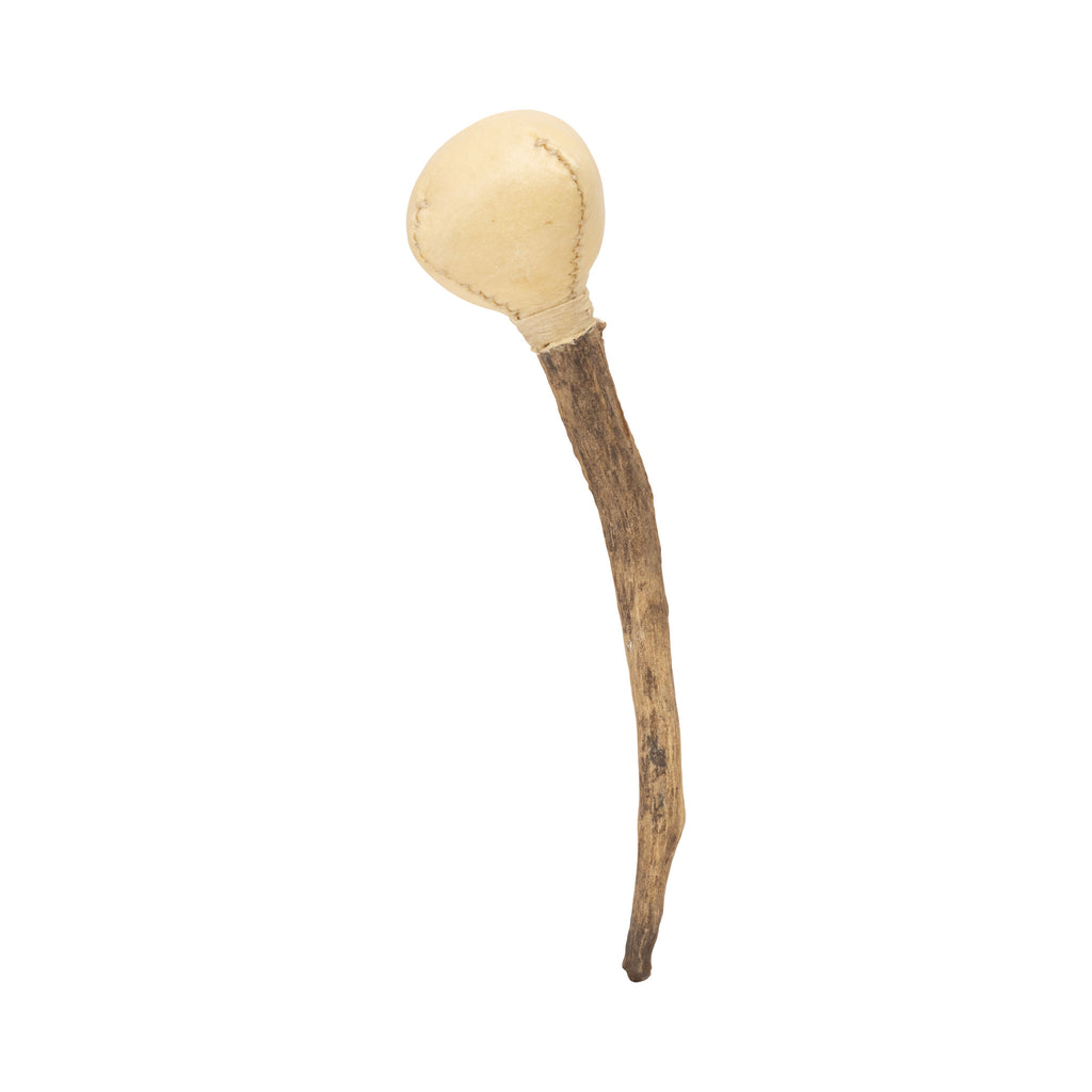 Collection of five Puyallup Tribe (Tacoma, Washington) dance rattles. Used by Jumping Gray Squirrel. All of hide, two with antler handles. Longest 12"