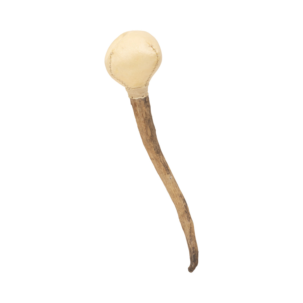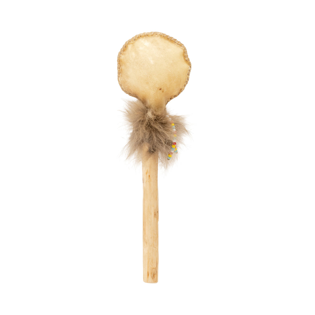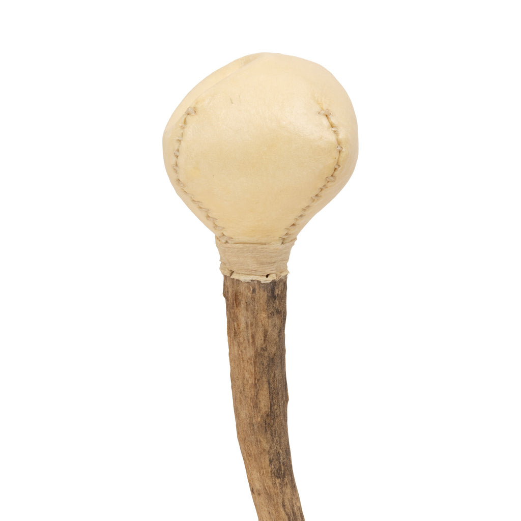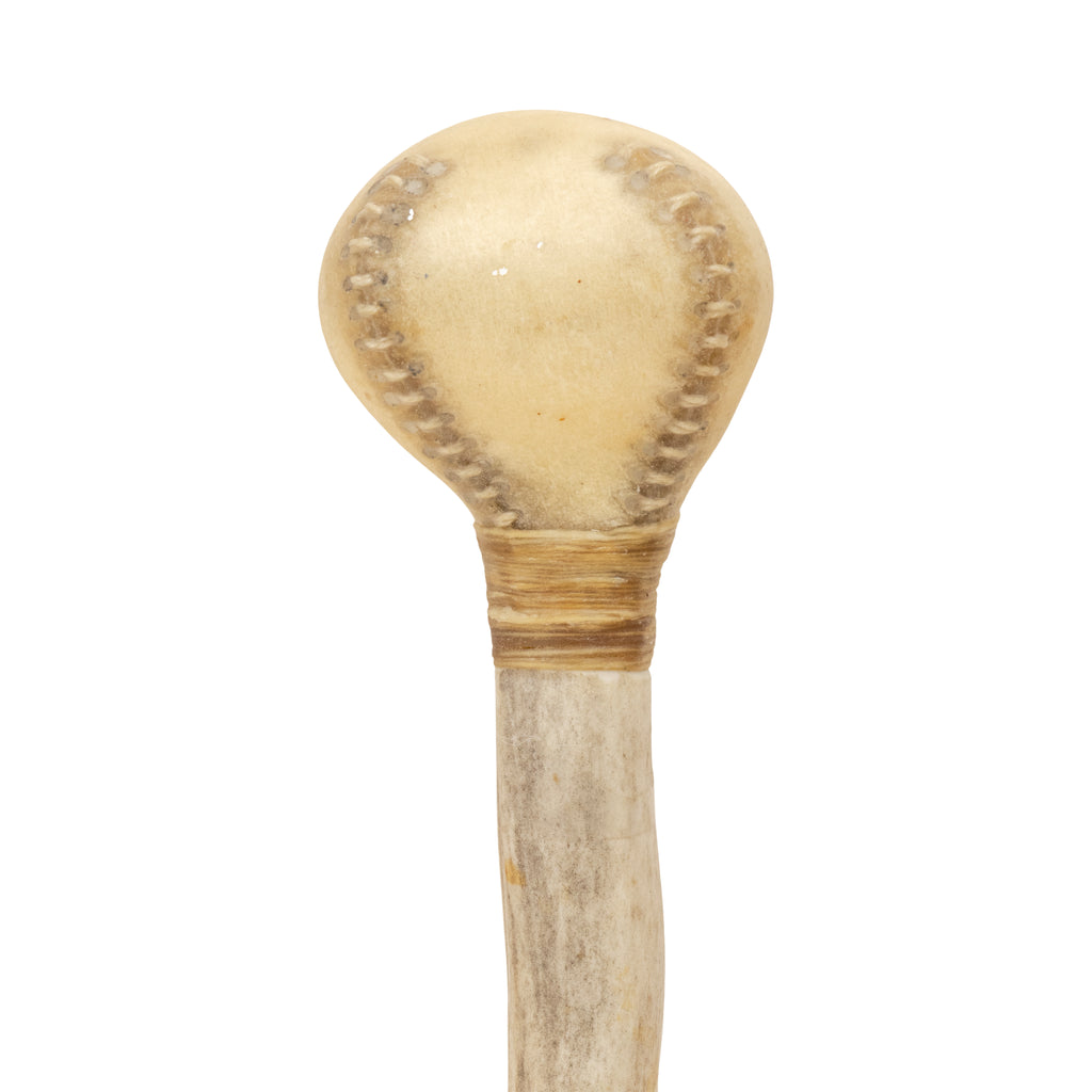 Collection of five Puyallup Tribe (Tacoma, Washington) dance rattles. Used by Jumping Gray Squirrel. All of hide, two with antler handles. Longest 12"