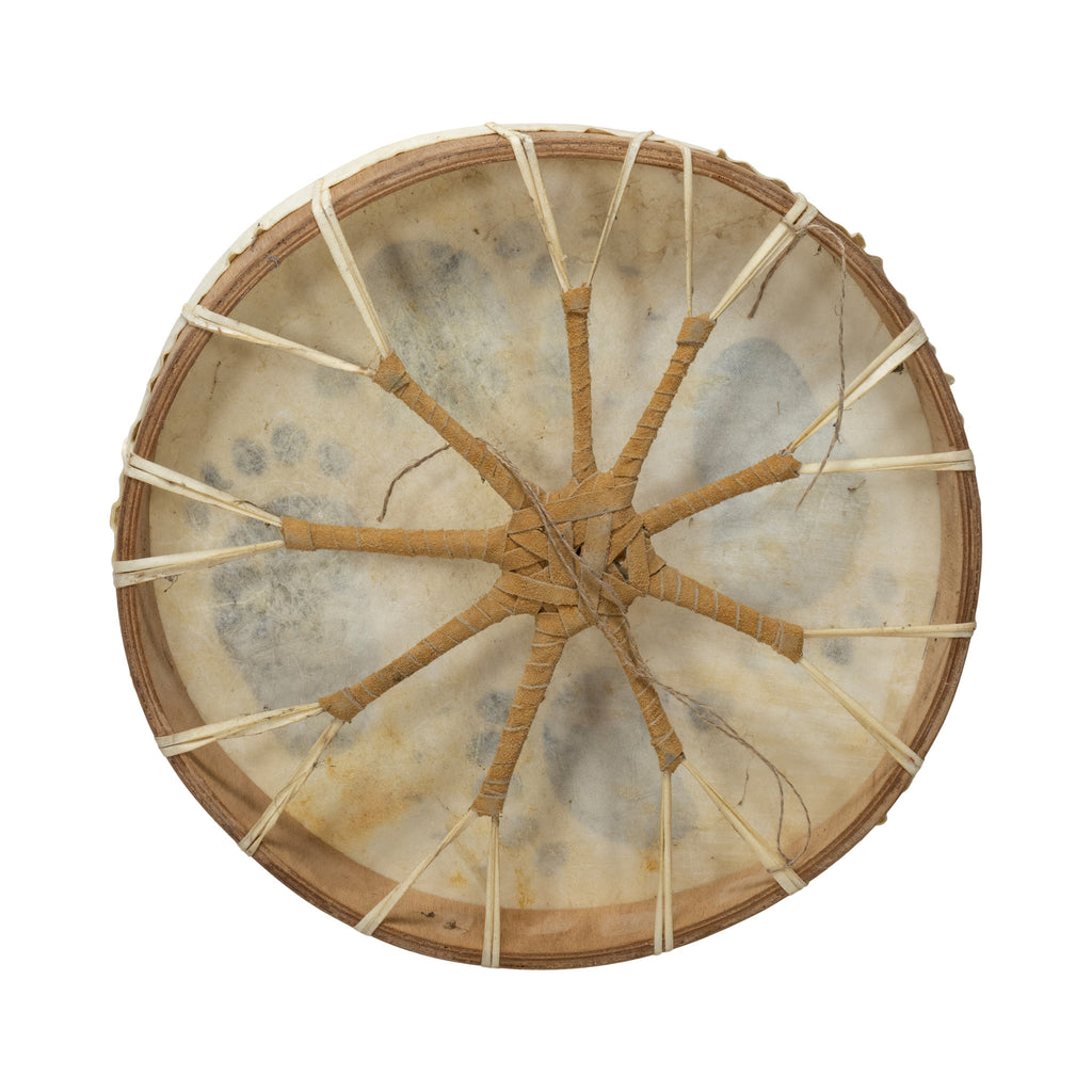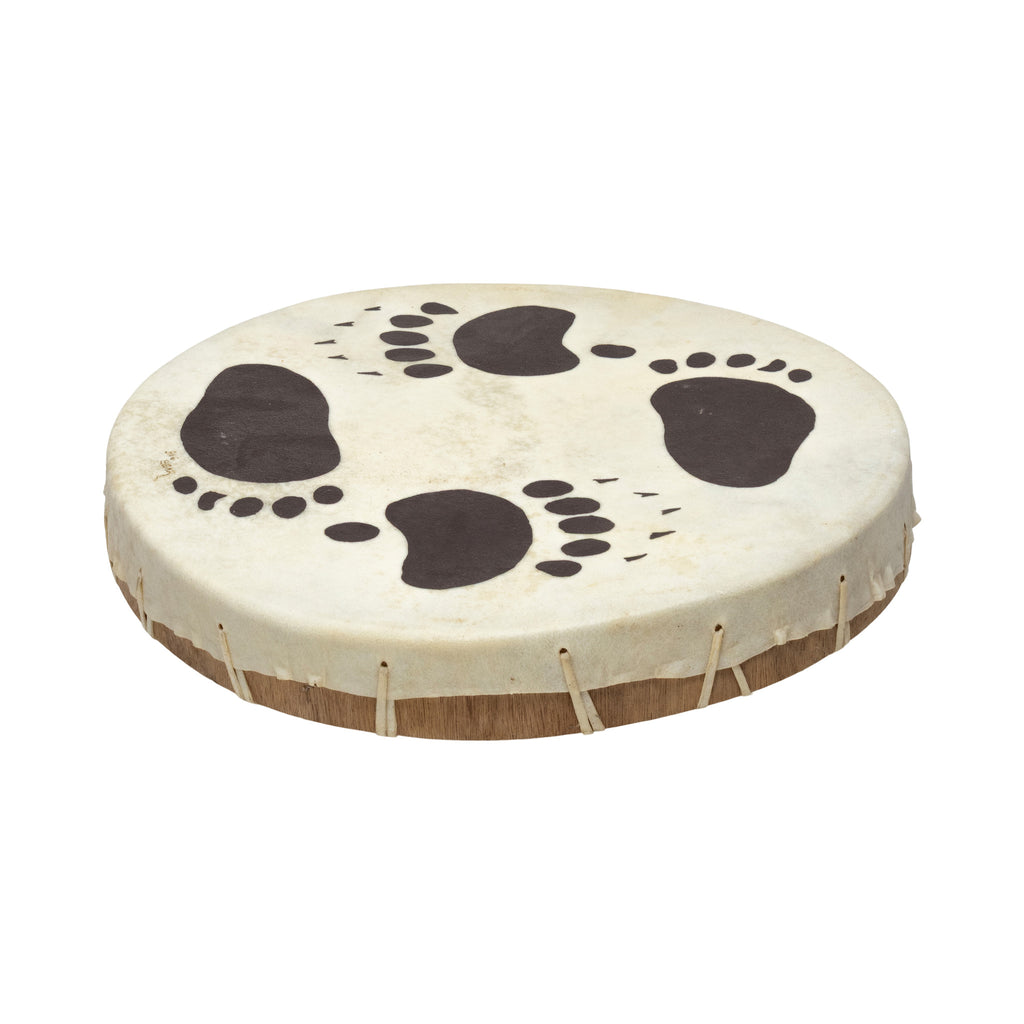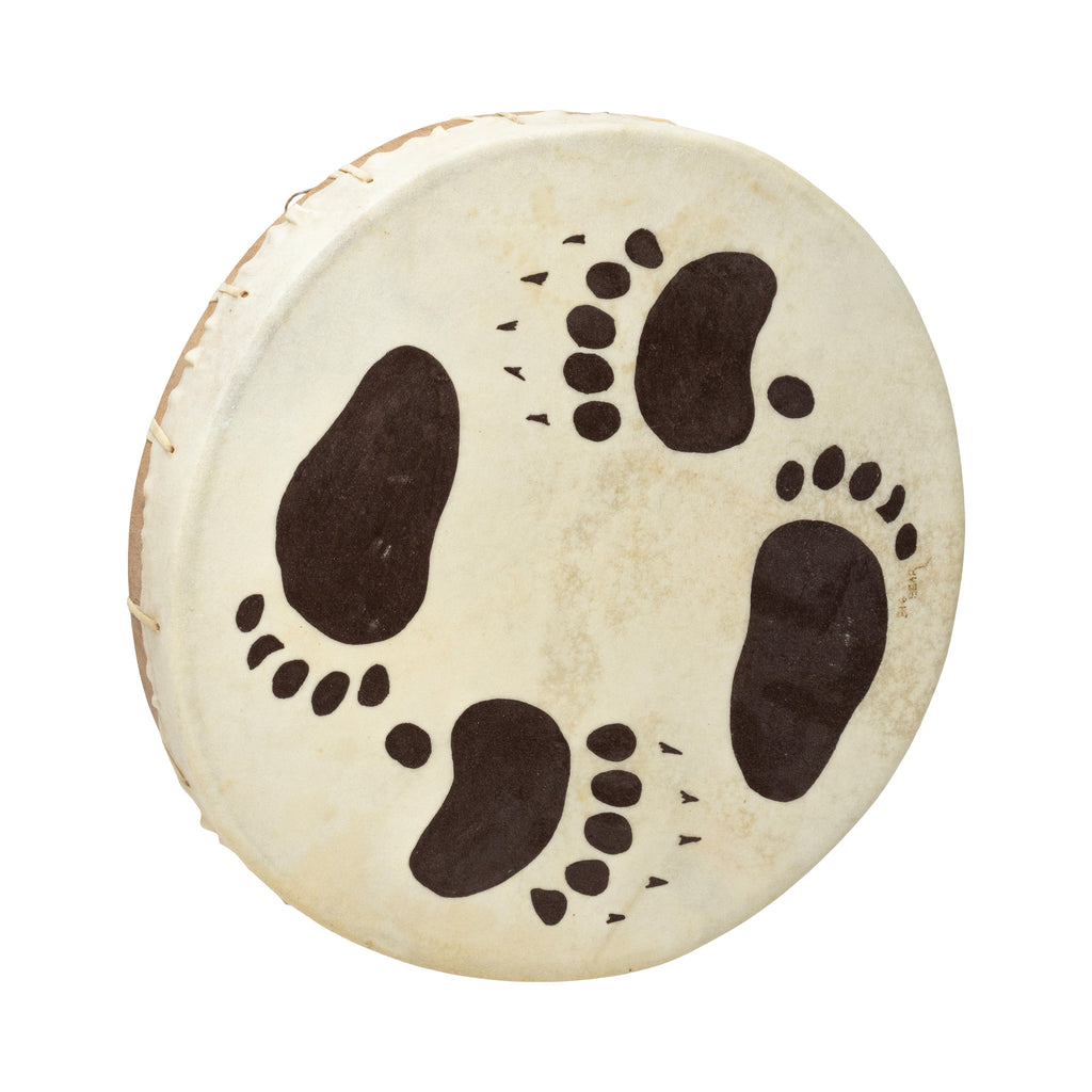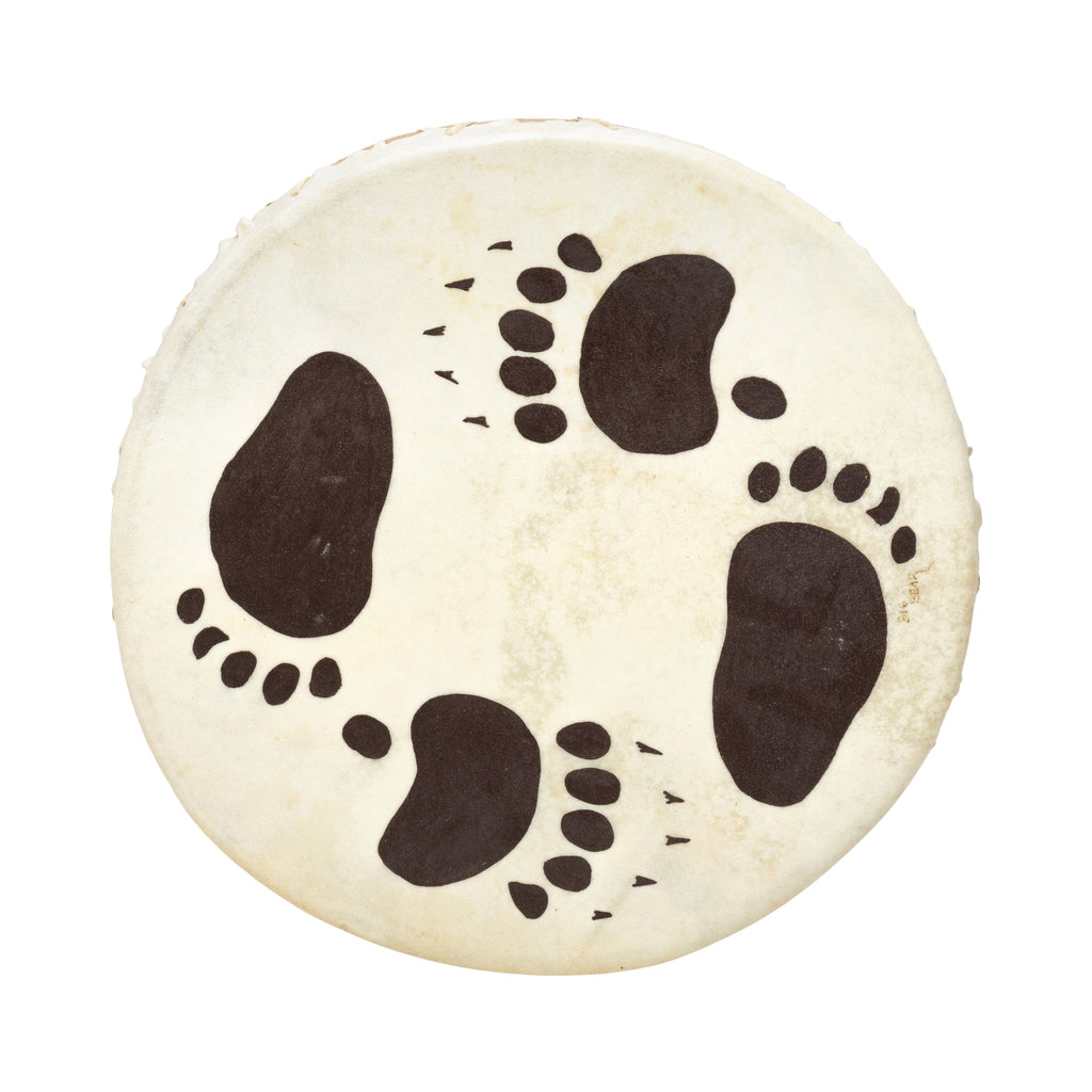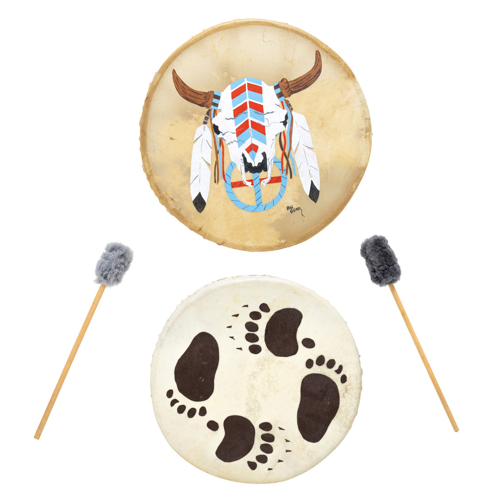Pair of Puyallup Tribe (Tacoma, Washington) drums with drum beaters used by Jumping Gray Squirrel. Both signed Big Bear. Painted buffalo skull. Contemporary. 19" x 3 1/2" bear paws 19" x 3".