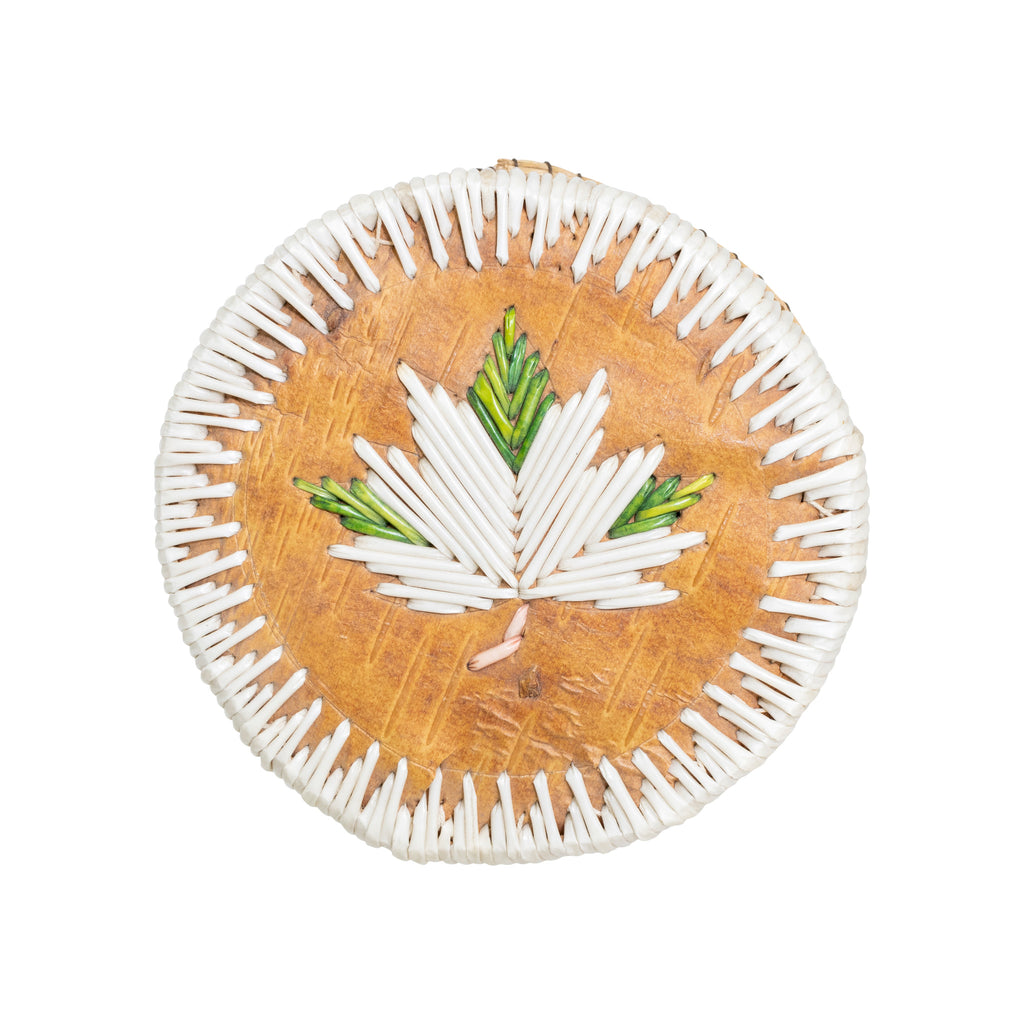 Quilled cylindrical birch bark box with maple leaf on lid. Birch bark, quills and sweetgrass.