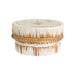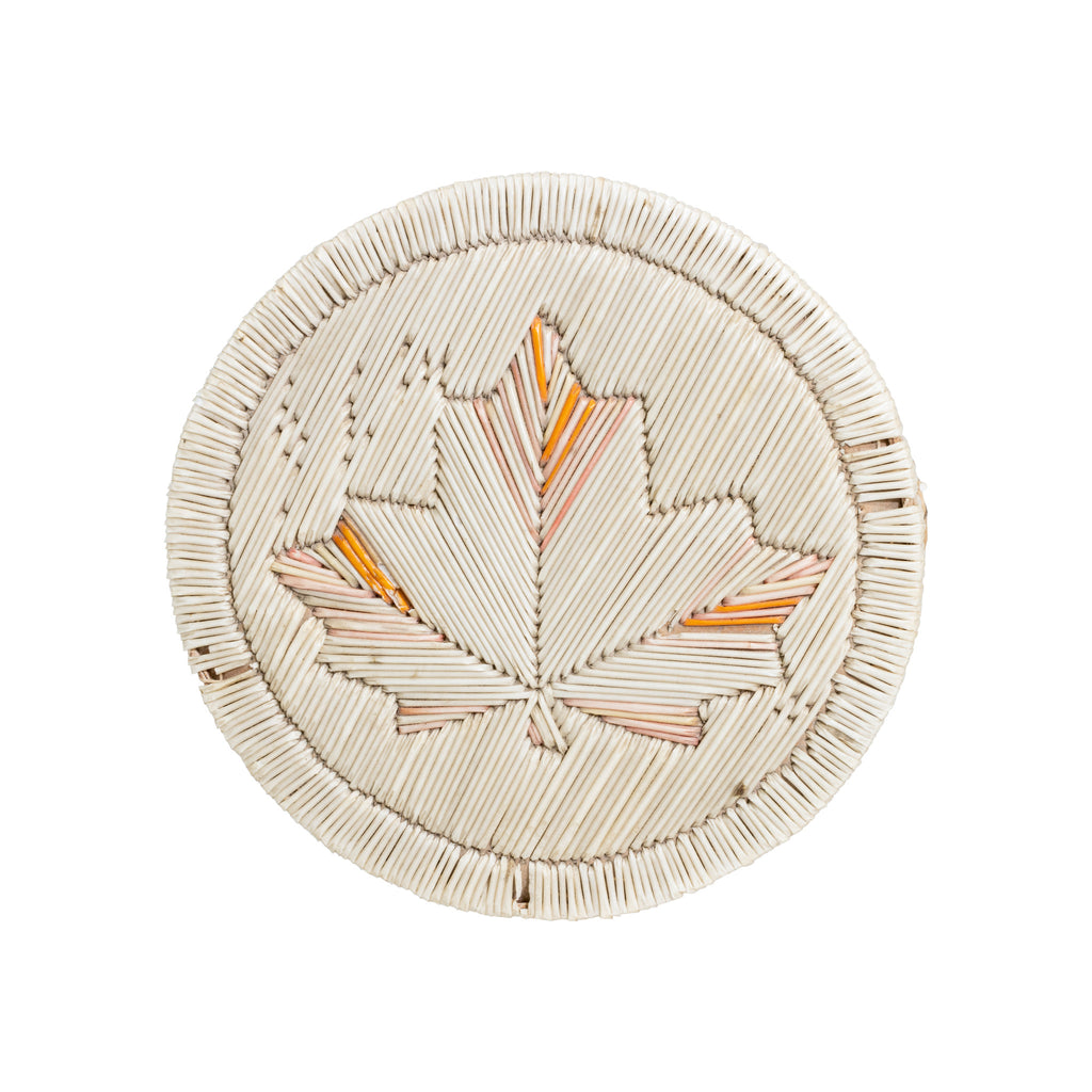 Chippewa cylindrical quilled birch bark box with fully quilled top having a maple leaf. Shows minor wear on edges. Birch bark, quills and sweetgrass.