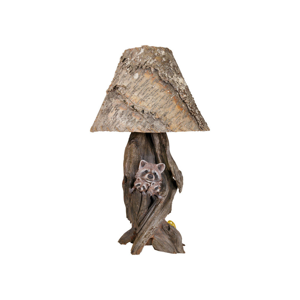 Raccoon table lamp with mother and two babies. Realistic carvings on natural driftwood base with rustic birchbark shade having antler finial. Original signed and dated by North Idaho artist Paul Carrico. Base 10" x 10", shade diameter 18", overall 30"H