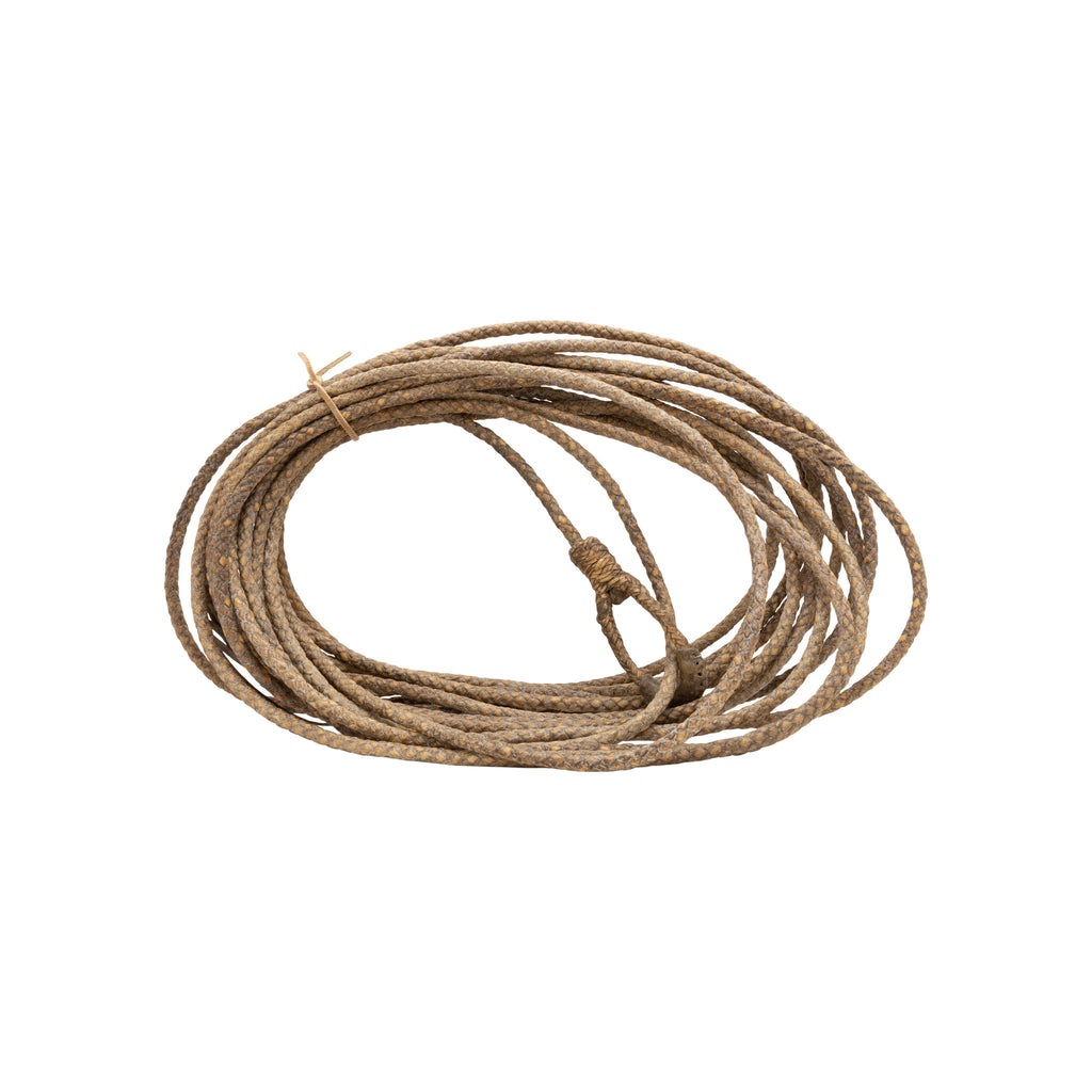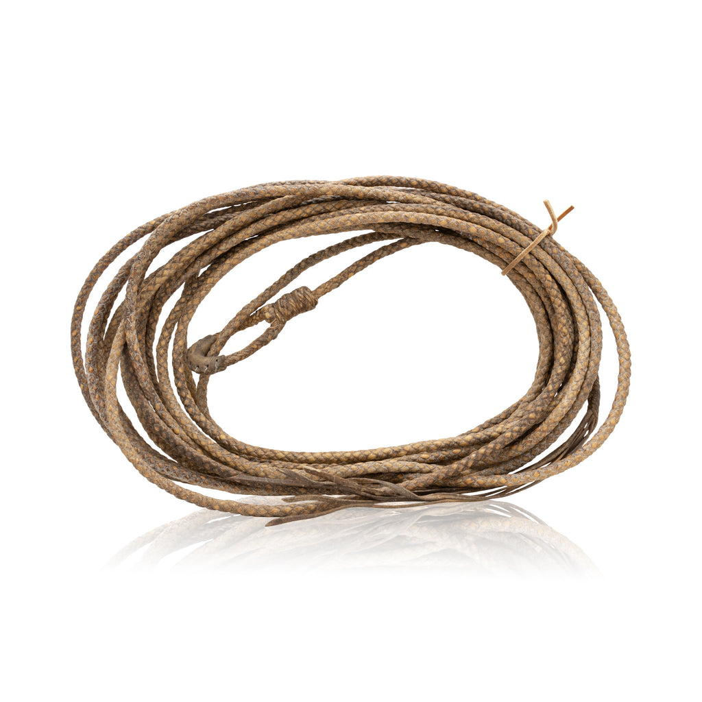 Rawhide riata. Approximately 50 feet. Six plait, unique hondo. Came off a Montana ranch.