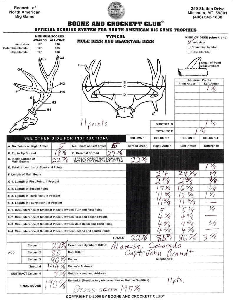 190 6/8" net typical mule deer shoulder record book Boone & Crockett taxidermy mount. This mule deer will make the Boone and Crockett All Time Record book. This buck was harvested near Alamosa, Colorado. Score sheet accompanies. 27"W x 34"H protrudes 29"