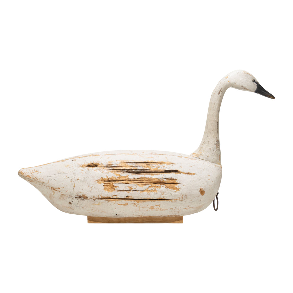 Full size whistling swan decoy by Reggie Birch, Chincoteague, Virginia. "R.Birch" carved in underside. A large railroad spike is attached as a balise. Two oak boards have been glued to underside so the swan will display without tipping. Reggie is an award-winning carver who has been carving decoys since 1977. He began with small waterfowl and progressed to full scale carvings.