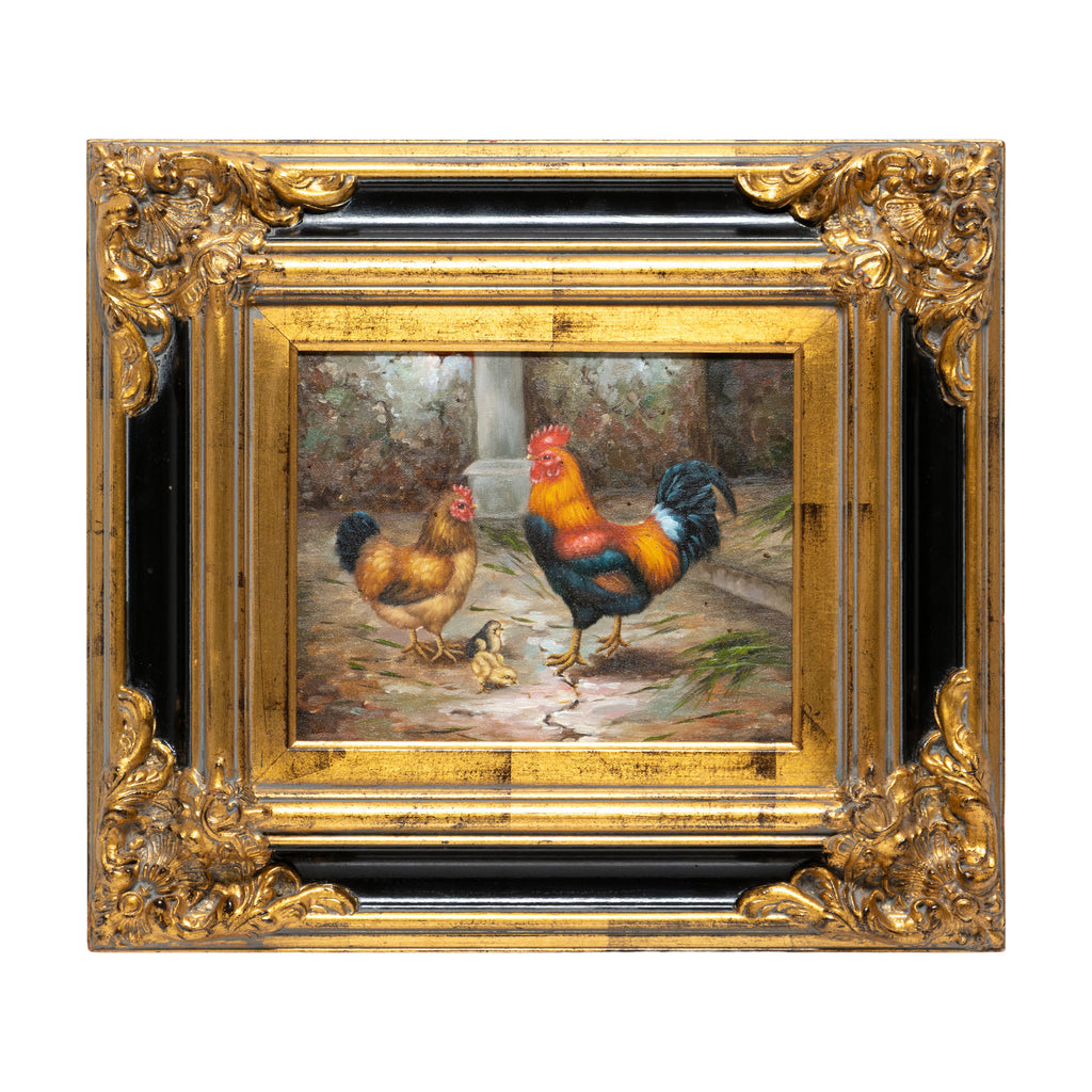 Oil on canvas painting of roosters. 7 1/2"H x 9 1/2"W frame 15 3/4"H x 17 3/4"W