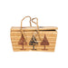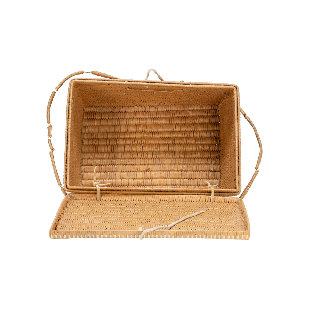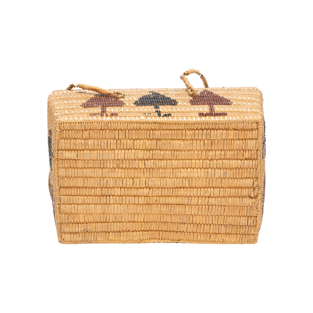 Salish picorial lidded trunk basket with handles and brain-tanned thong. Christmas tree design. 15" x 10" x 8"