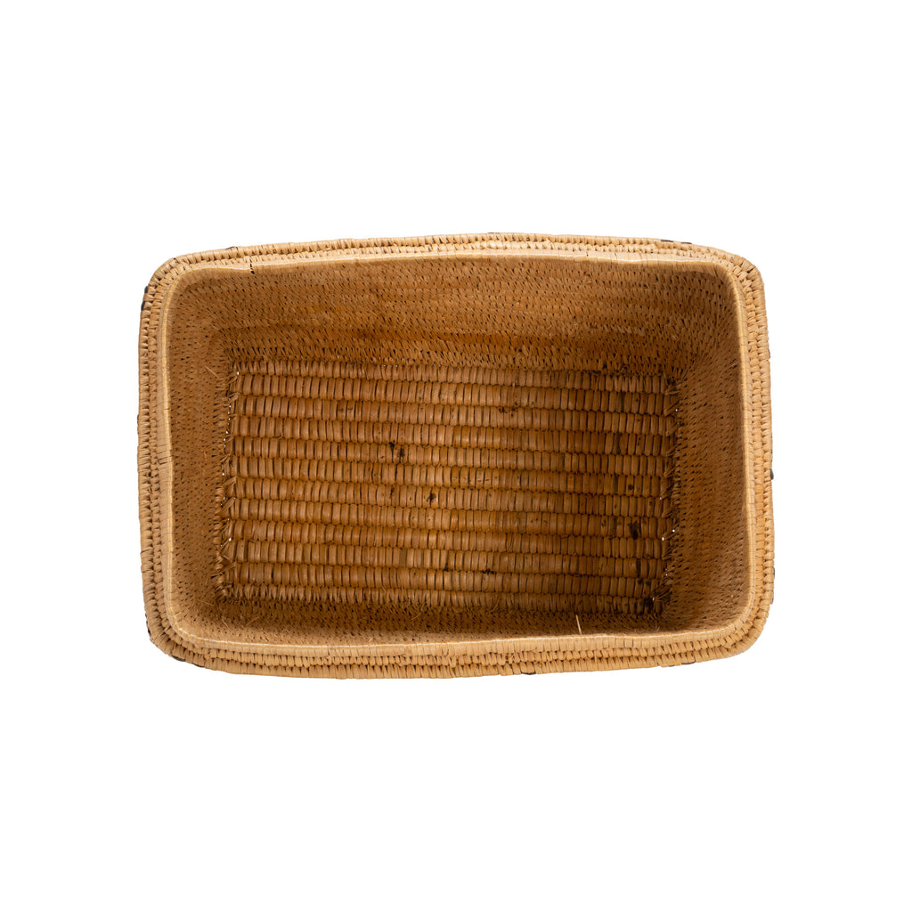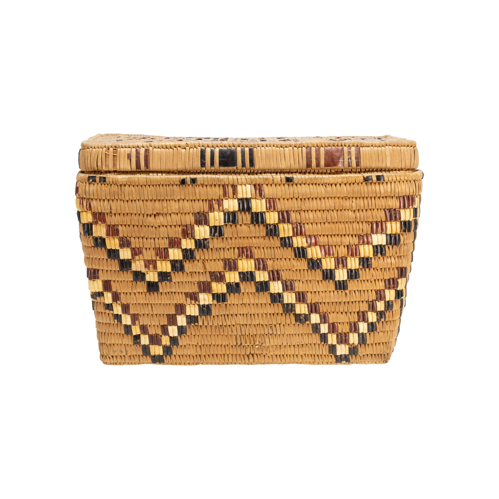 Salish lidded trunk basket with two wavy lines. 15" x 10" x10"H