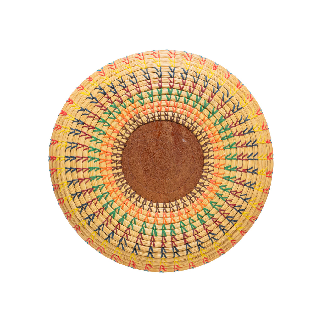 Collection of 4 Seminole baskets. Palmetto bases, sweetgrass stitched with brown, turquoise, orange, blue freen, red, purple and yellow thick thread. From Big Cypress Reservation.Ex. Anhinga Museum. Hourglass shaped basket with flared top rim and two extended handles 1" out from basket. 9 1/4"H x 7 1/2"D Olla-shaped basket. 6-1/2"H x 11"D Large double handled basket. 19"D x 9"H Seminole lidded basket by Donna Frank. 14"D x 6"H liddled