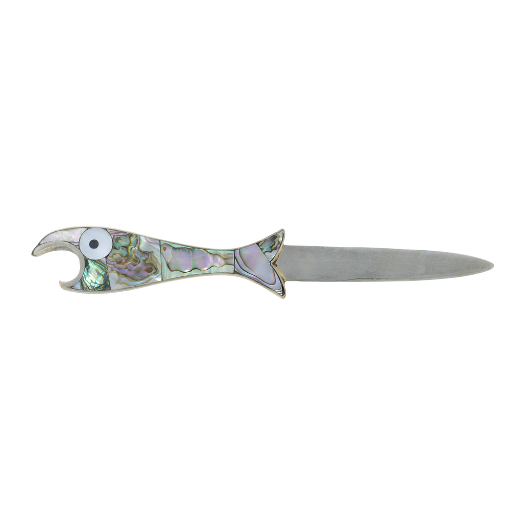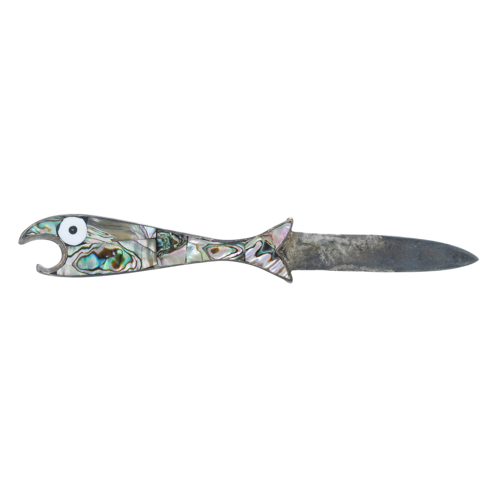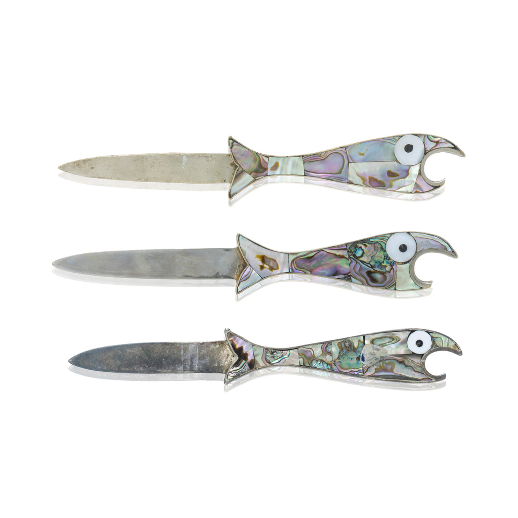 Set of three matching Alpaca silver fish bottle openers with knife and abalone inlay.