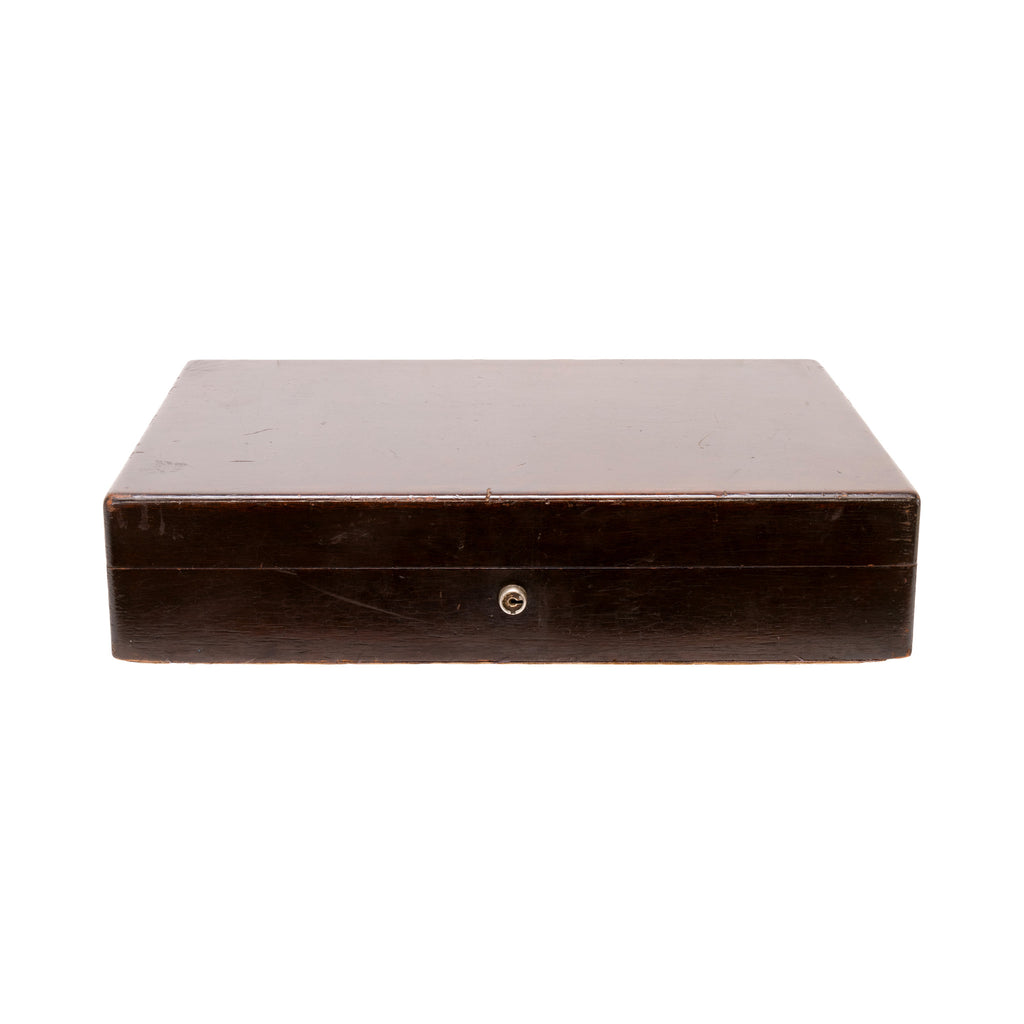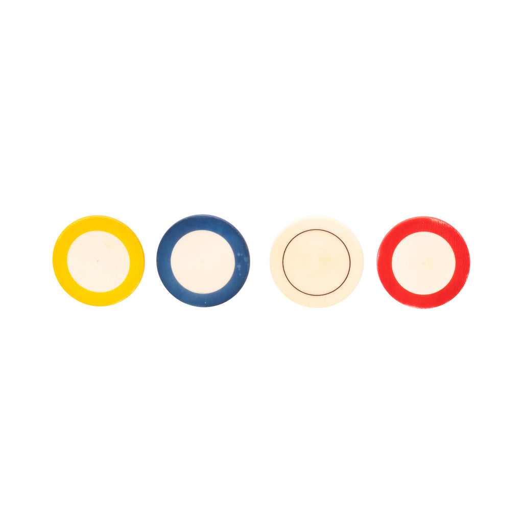 Collection of 360 ivory poker chips in original box. Chips with concentric circle design, and in red, white, blue and yellow colors. Contained in an original walnut lined case. Dating to the turn of the century, these chips show little wear with some light fade to some of the red and blue colors. 90 yellow, 90 blue, 90 white, 90 red, 360 total.