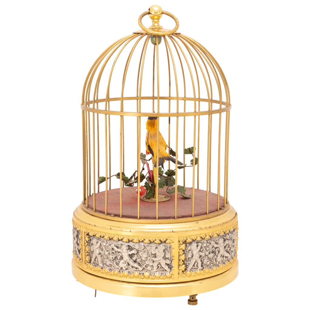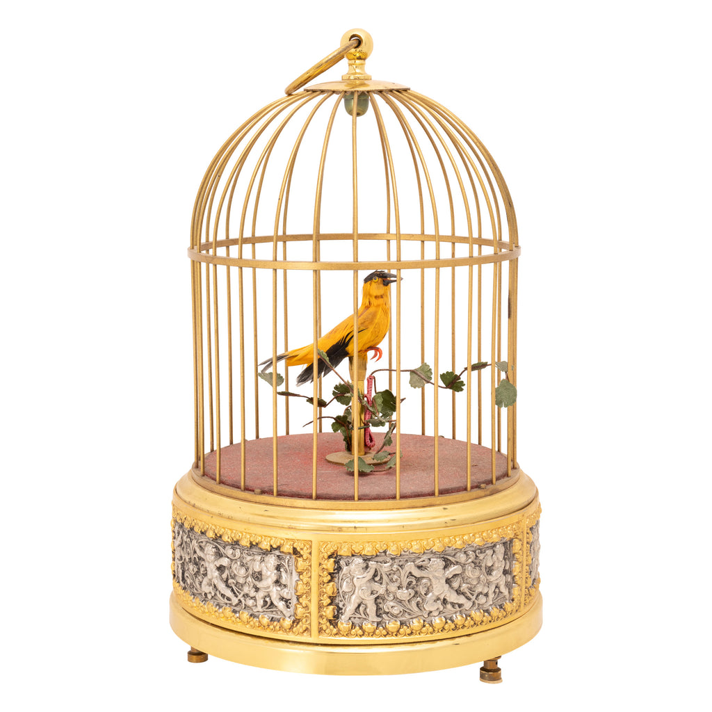Singing bird automatas. Bright feathers and good movement but sounds weak. Circa 1950. 9 1/2"H x 6"D
