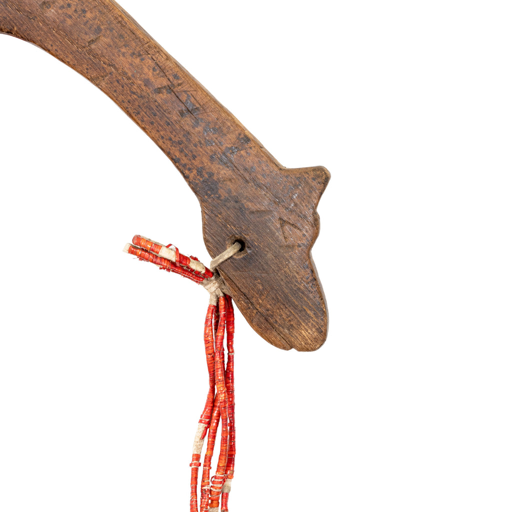 Sioux horse stick with hatch marks representing coups along top. Found by an antelope hunter in South Dakota. Quilled drops ending in tin cones with feather fluffs (added). Ex. Kornwolf