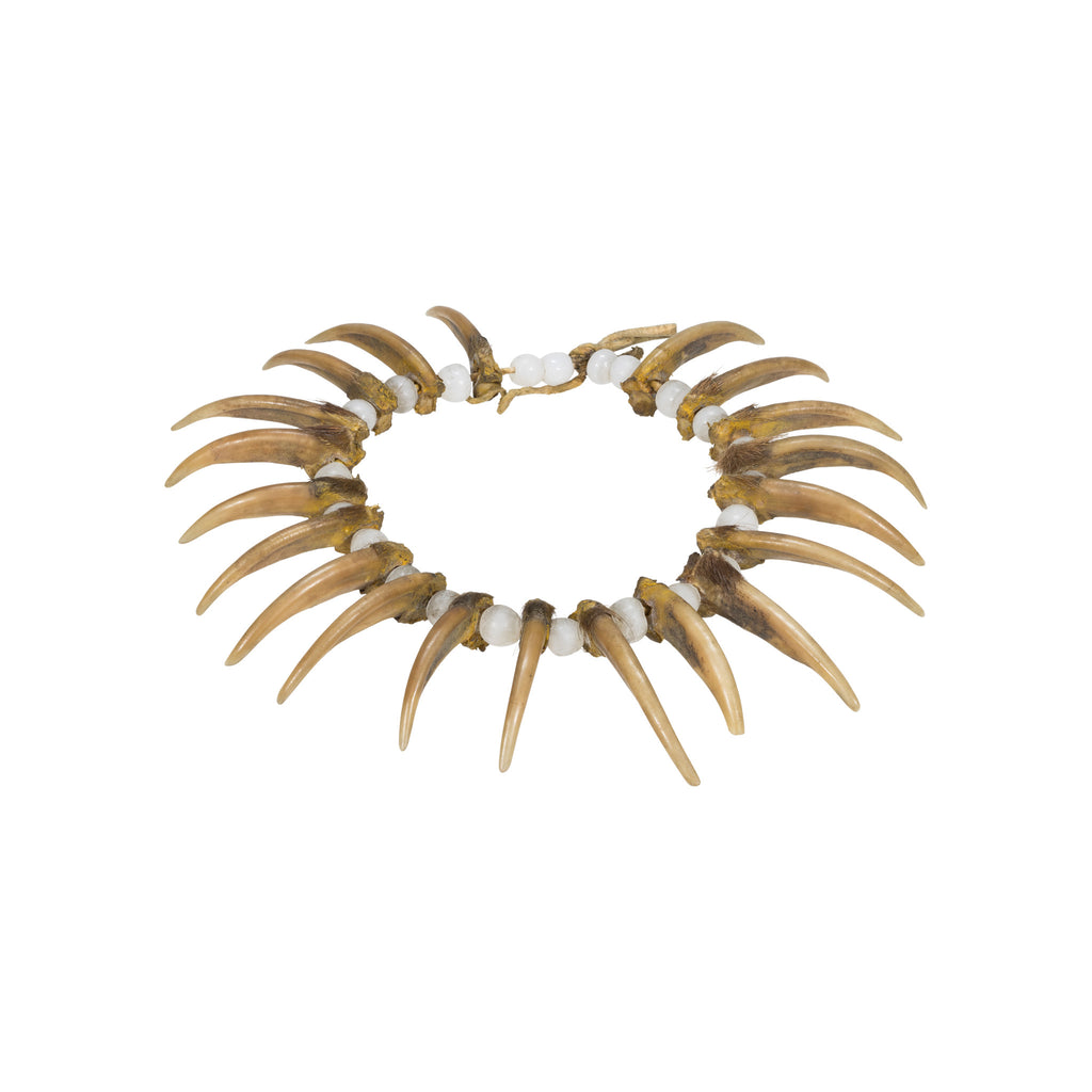 Sioux made warriors badger claw choker with original ties. Has been shortened from original length but probably all beads and claws remain. Was tied behind neck. White beads show good age, some encrusted others cleaned. Ex. Lakota Museum.