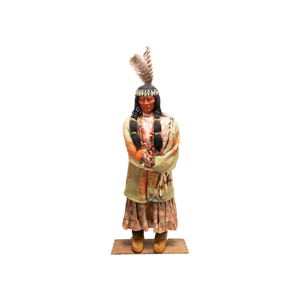Male and female kookum store displays. Female having papoose on back and wrapped in Beacon blankets. Original moccasins, headdresses and necklaces. Mounted on fruit crate slats. Skookum dolls were first commercially produced around 1913 by Mary Mc Aboy of Missoula, Montana. The first skookums had dried apples for the head, wool/felt blankets formed the bodies that were then stuffed with dried twigs, leaves and grass. For the remainder of the body, they used cloth and felt. In 1920 the Arrow Novelty Company was making the dolls. At this time, they went to all composition heads which were painted with life like facial characteristics. The dolls represented real Indians of various tribes as seen on reservations. By 1929 The H.H. Tammen Co. of Denver and Los Angeles had taken over production. After 1949 the legs and feet were made of plastic. Skookum dolls with wooden legs and felt covered wooden feet were made between 1917 and 1949. 40".