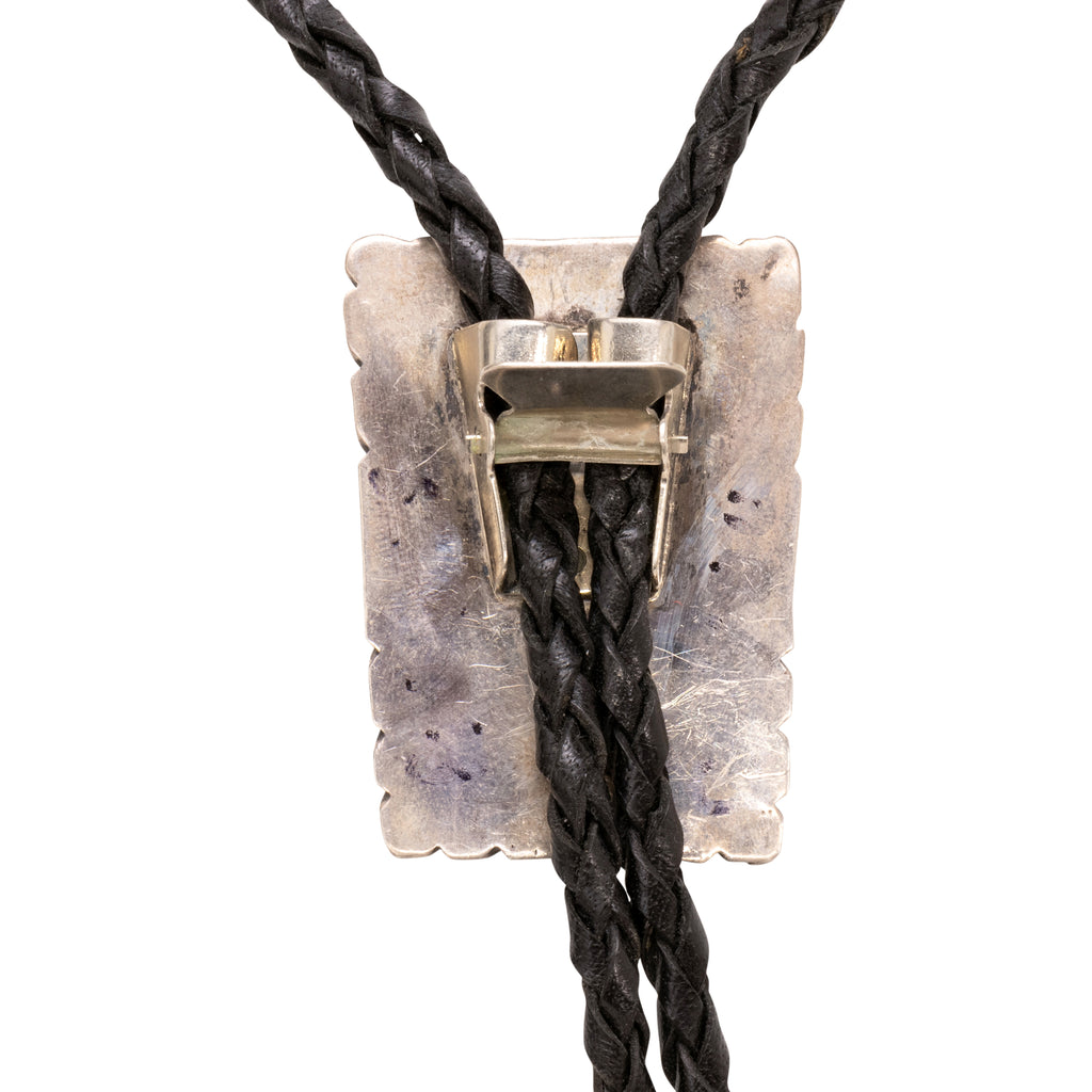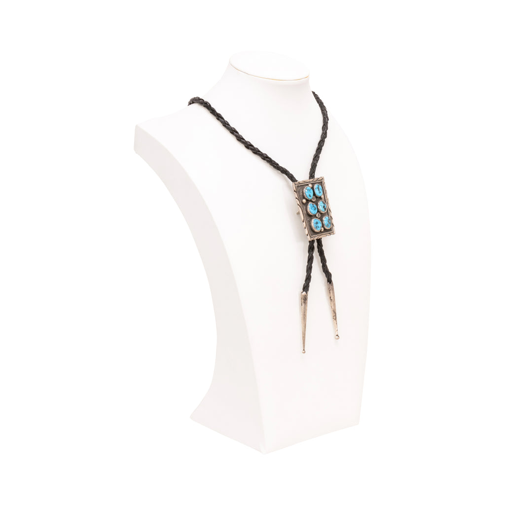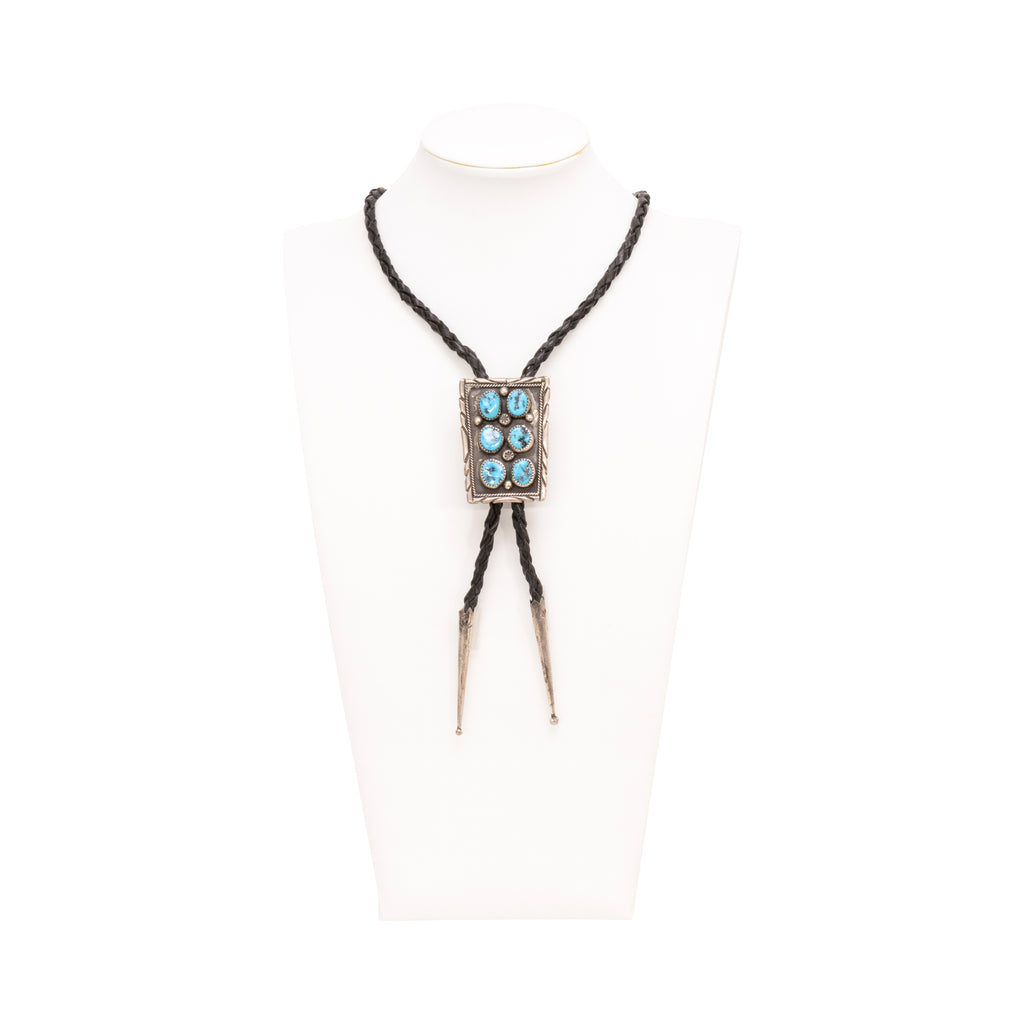 Trapezoidal bolo in shadow box with double border and six exceptional sleeping beauty turquoise nuggets.