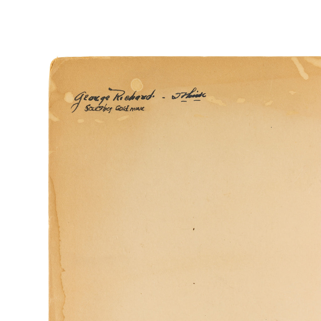 Soulsby Gold Mine Photo by George Richard. From Soulsby, California. Original period photo of two 1880s - 90s of hard rock miners with tommy stickers and candles in the timbers. One of George Richard. Signed on back. Identified on the reverse as "Soulsby Gold Mine/George Richard". Vintage photo 7" x 9", mat 9" x 11"