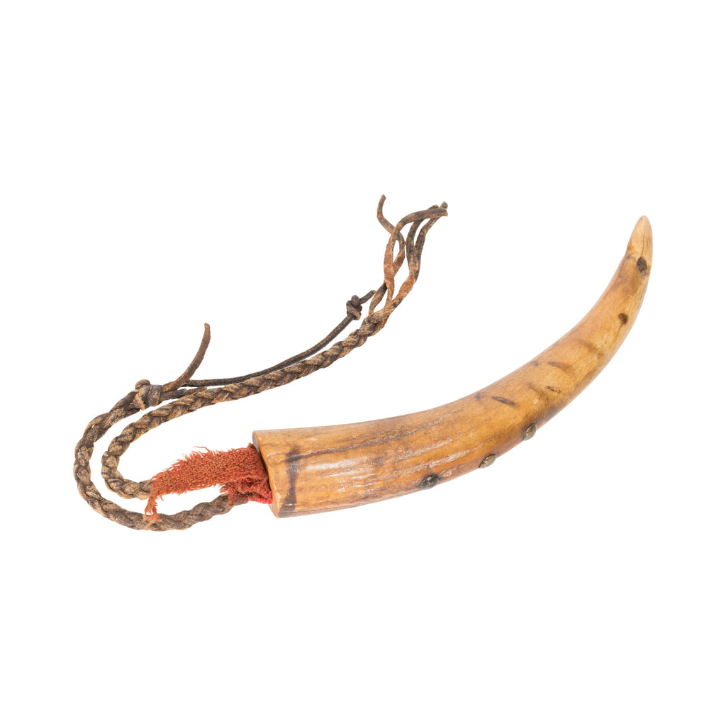 Southern Cheyenne Elk antler studded quirt. The piece is comprised of a Rocky Mountain Elk antler tine having two strands of braided harness leather bull whips secured in the end with a wooden dowl and strips of old red stroud wool trade clothe. The top of the quirt shows three solid square shank old brass trade tacks and the base of the quirt shows a hand drilled pierced hole which would have held a beaded wrist throng at one time. The antler has a dark yellow to red brown patina coloring from honest age and use with ridges of the antler being worn smooth along most of the piece and a heavy weight overall. The Indian Wars era piece shows well preserved condition and displays excellently. Museum collection number E1048.