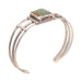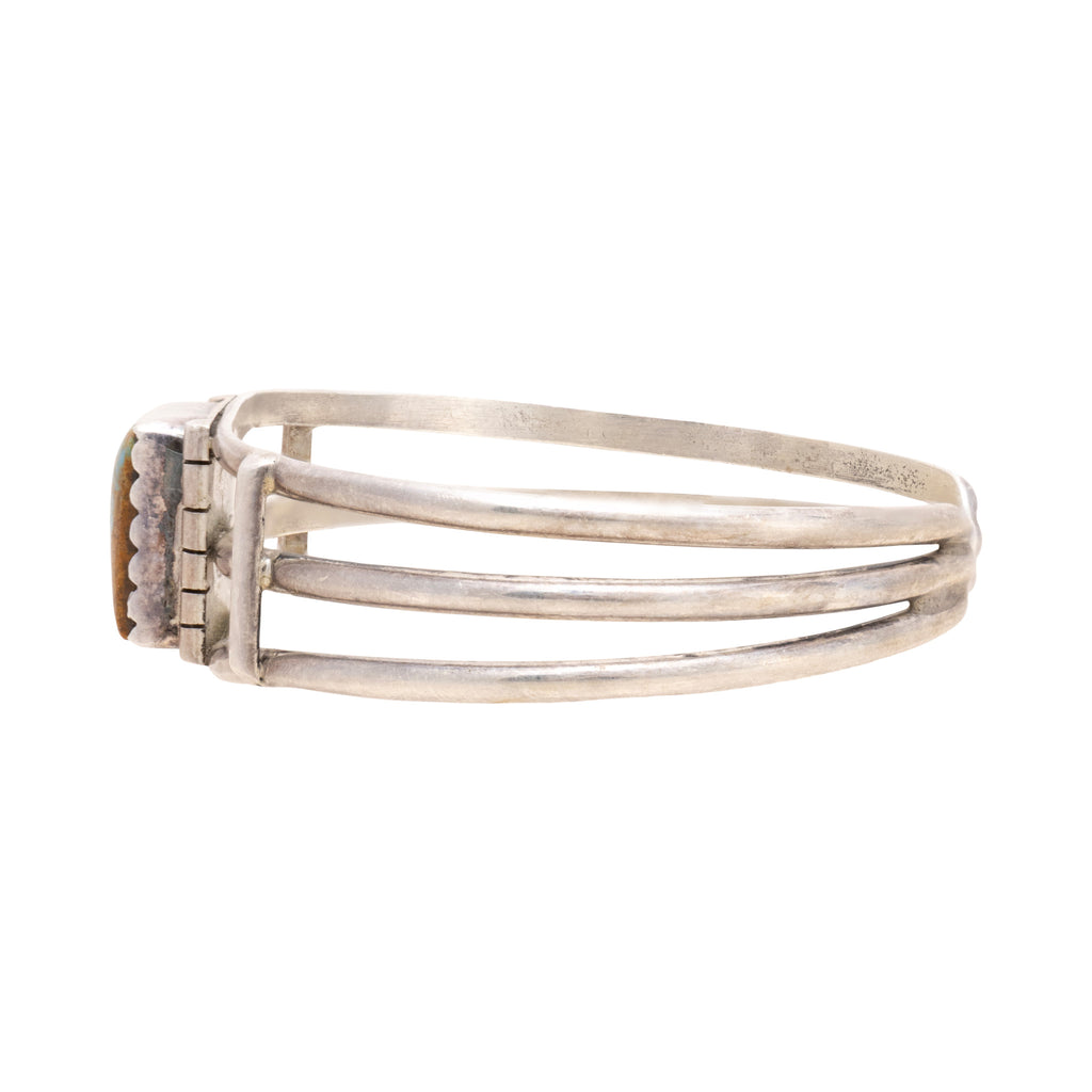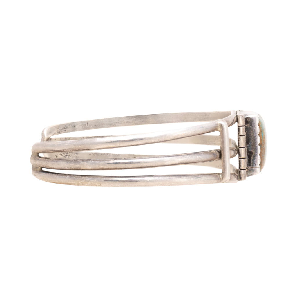 Southwest sterling silver and Kingman turquoise bracelet. Thin cuff bands allow for some flexibility. Unmarked. 16.48 grams, 5" plus 1" opening