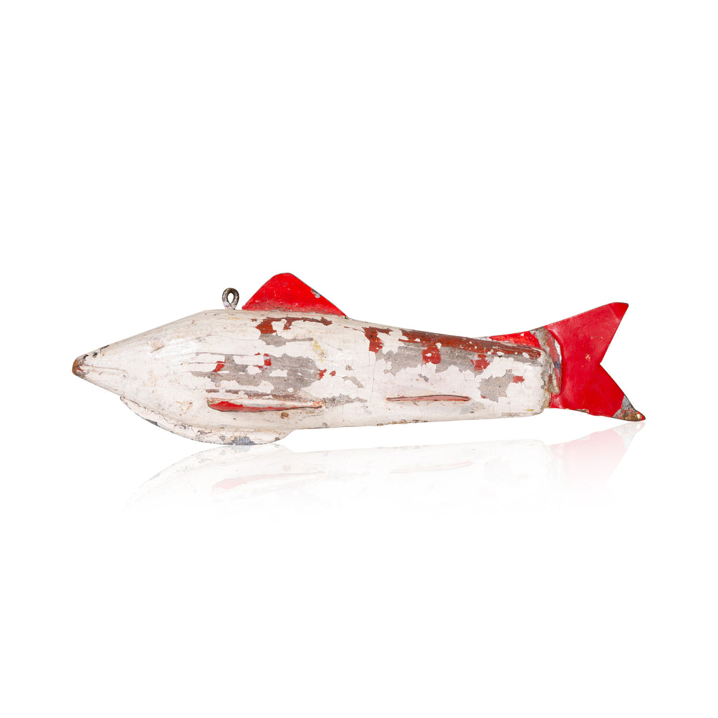 Red and white Minnesota spear fishing decoy. Several coats of paint similar to that used on Battle Point.