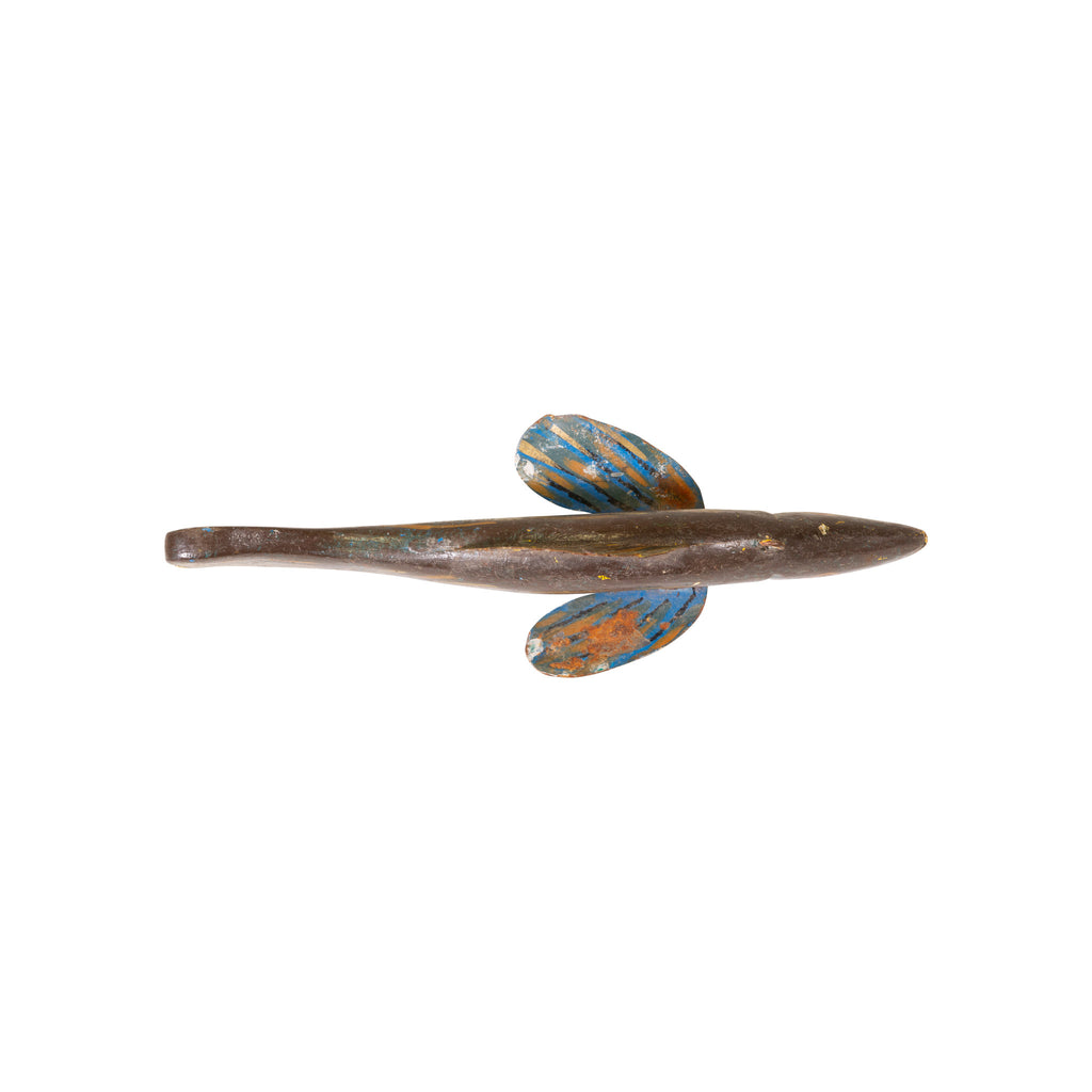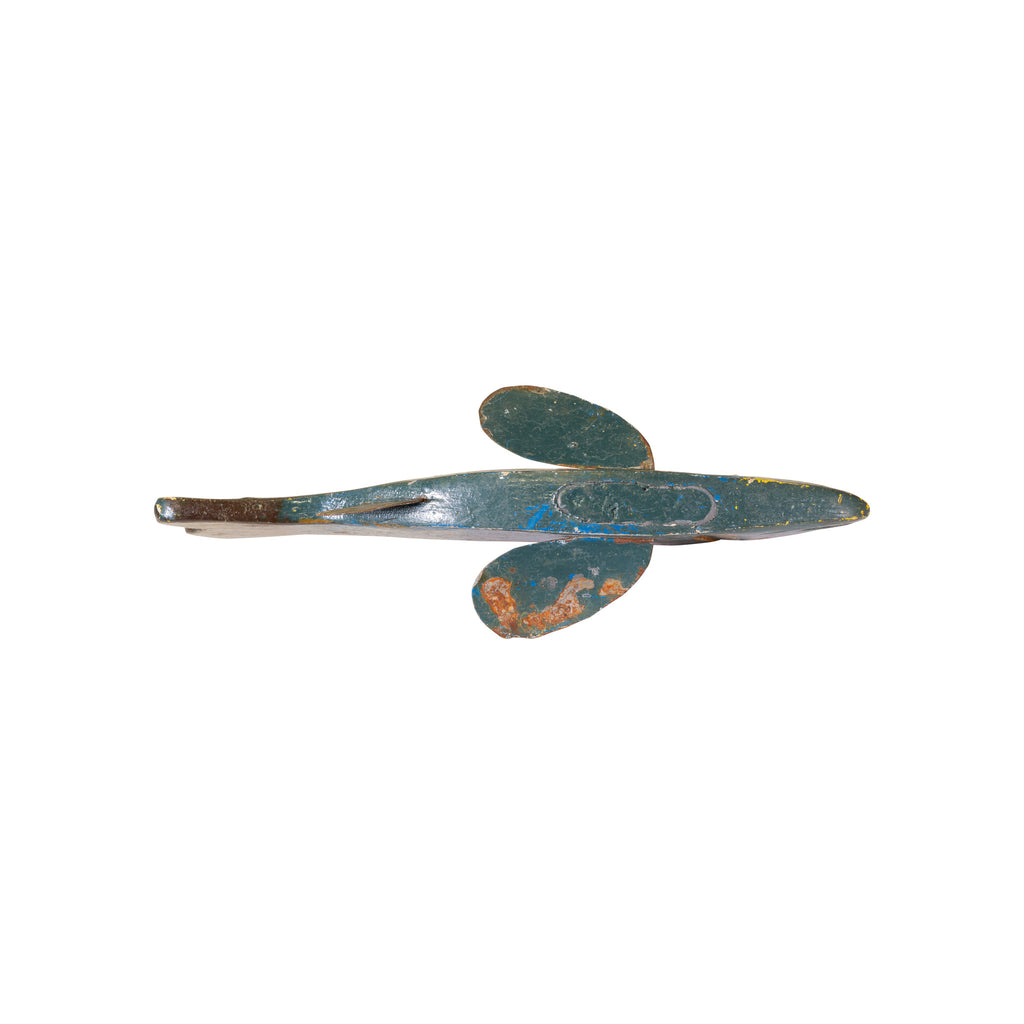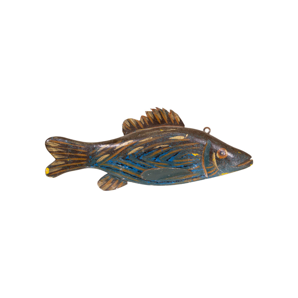 Folk art style Minnesota spear fishing decoy. Pan fish style, carved mouth, gill and wooden tail.
