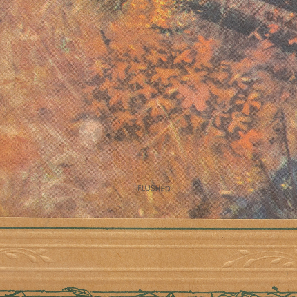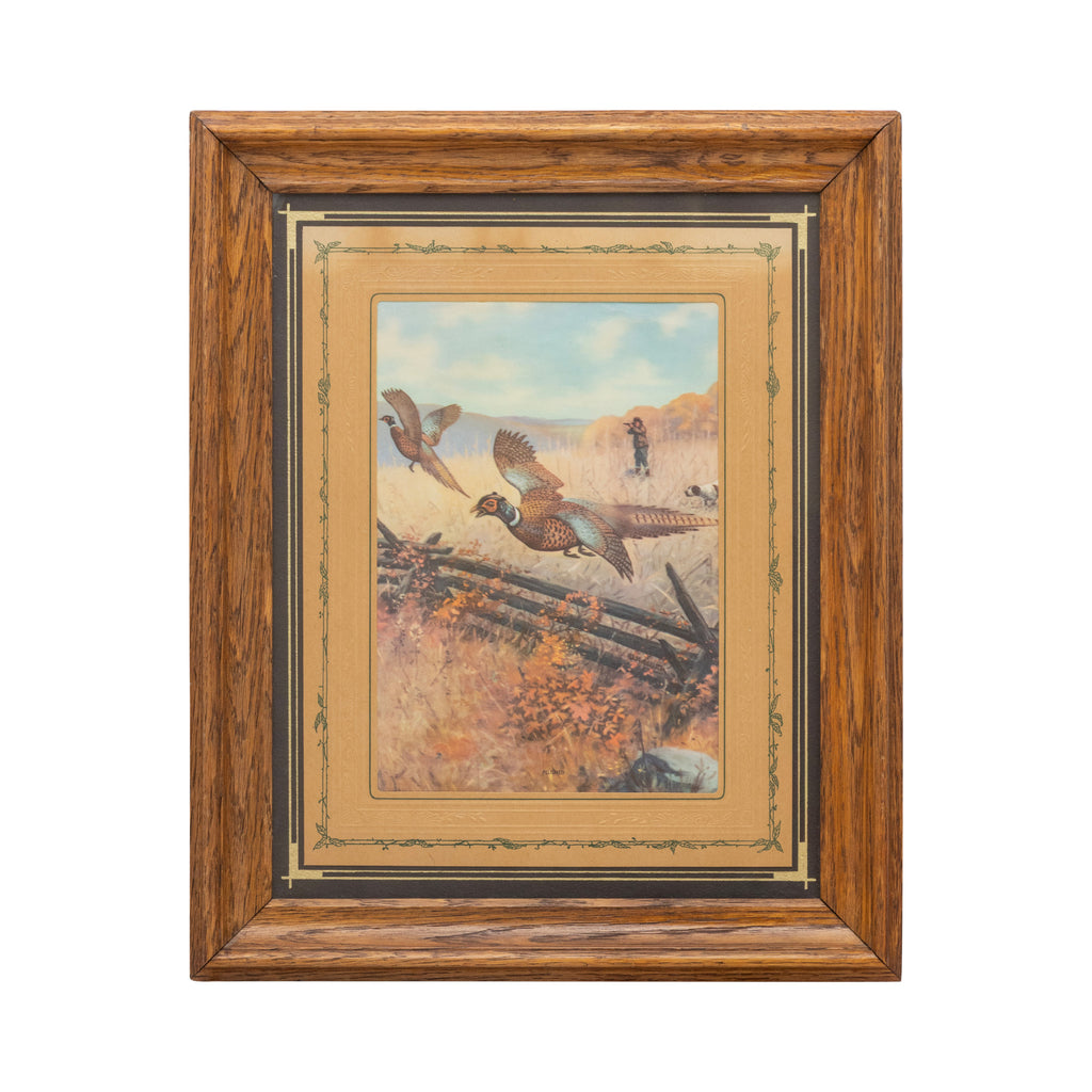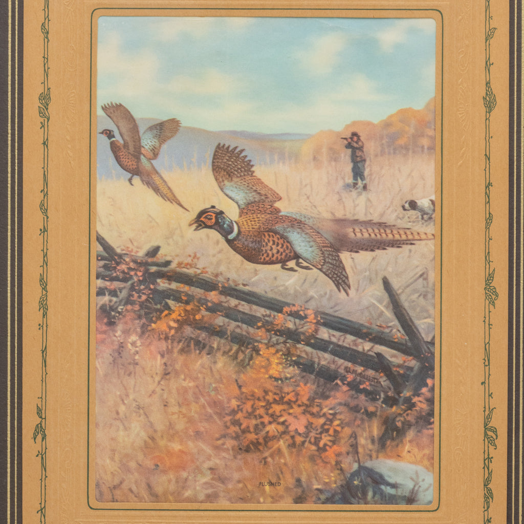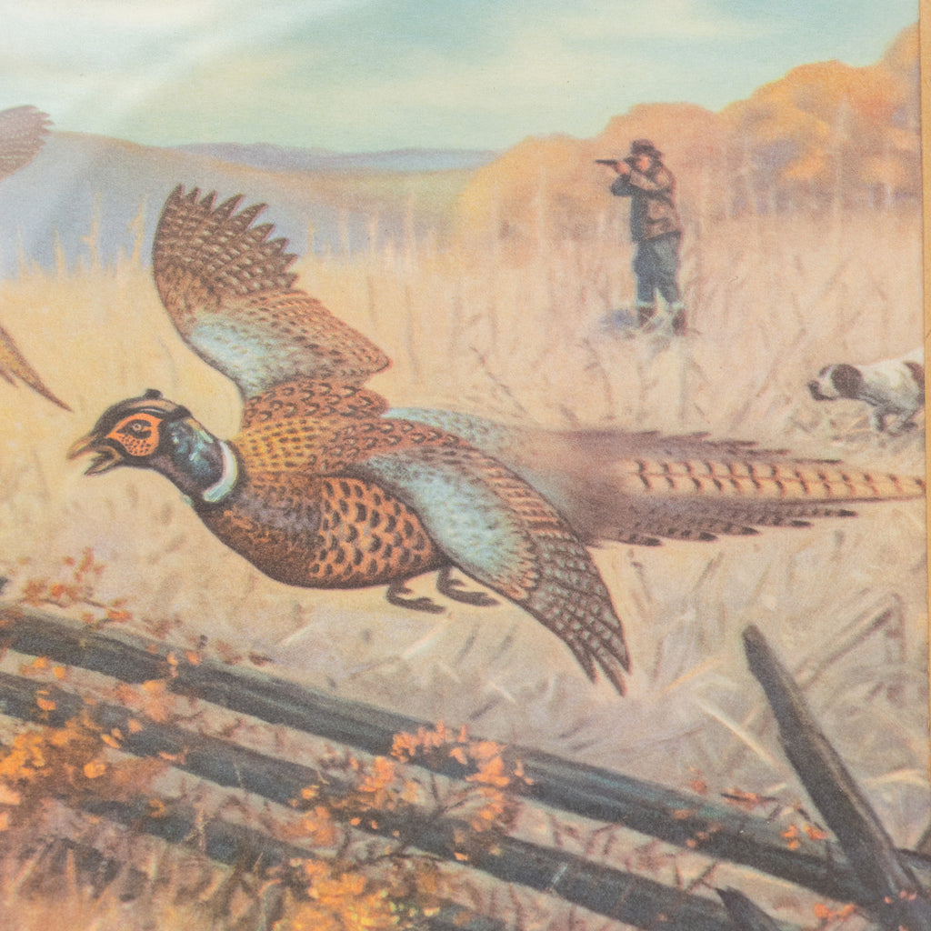 Sporting calender print with original mat. Gunner with pointer and two roosters flying over rail fance. Well framed and matted. Image 7" x 9", frame 13 1/2" x 16 1/2"