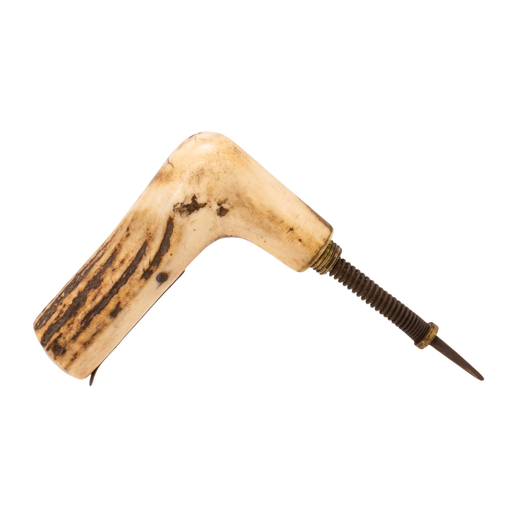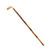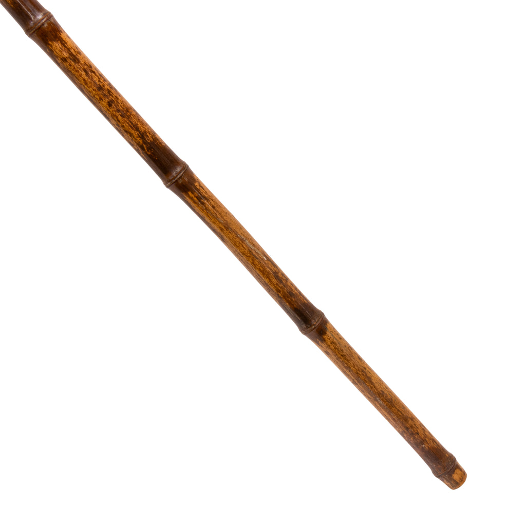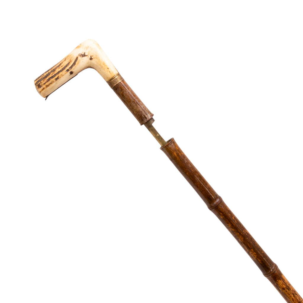 Stag gun cane. L shaped stag handle with beautiful patina and natural striations, gold metal collar with some dings, faux bamboo exotic spotted shaft and no ferrule. Handle is twisted to reveal compartment for loading, working trigger on bottom of handle. Great condition. 4 1/8" x 2 1/2", overall 33 1/2"