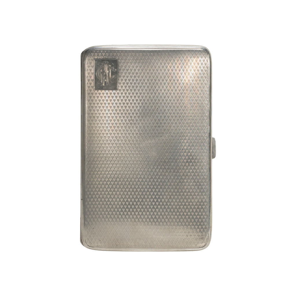 Sterling silver billfold. Diamond design with upper monogram in corner. Great Britain symbols stamped on inside with elastic band to hold items in place. Engraved "To Mr. A.H. Cecil with every good wish for the future from his many friends at Wimbledon Stadium 1928-1933." Securely opens and closes.