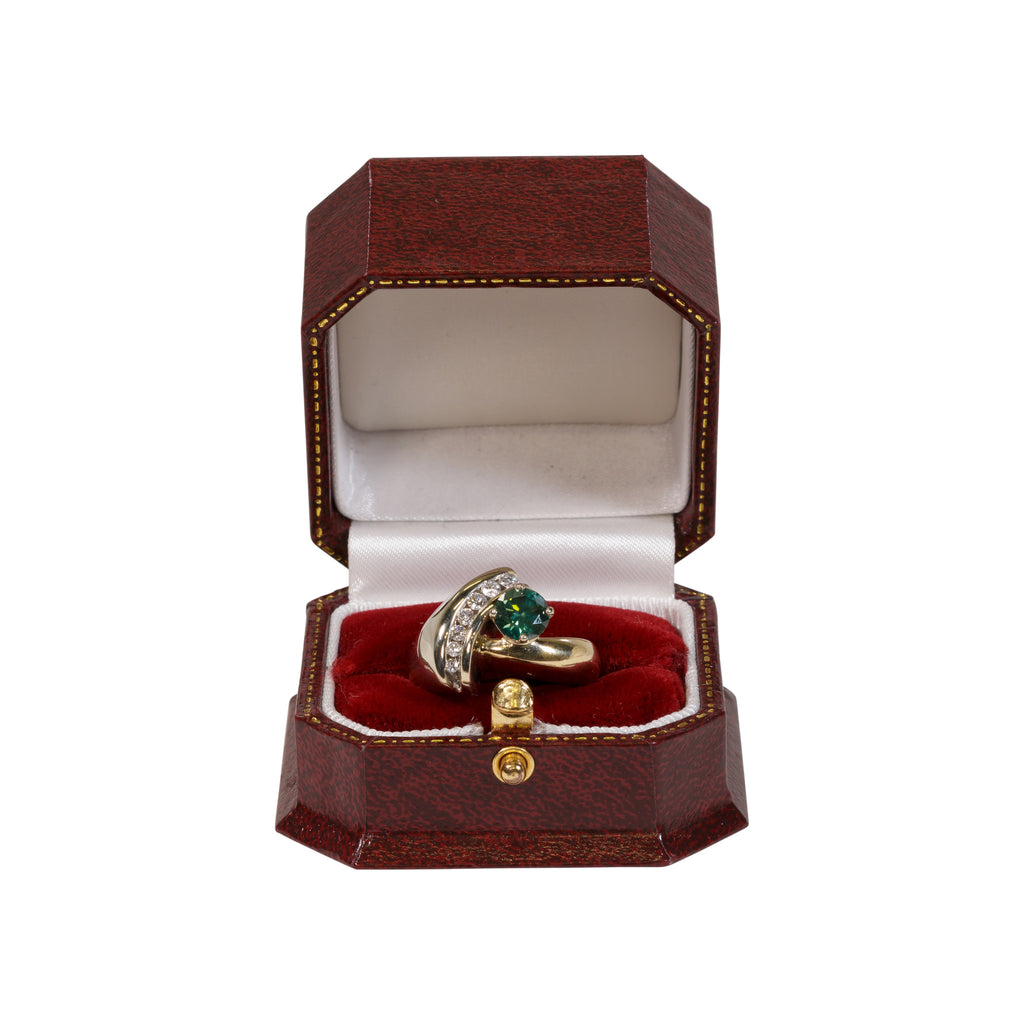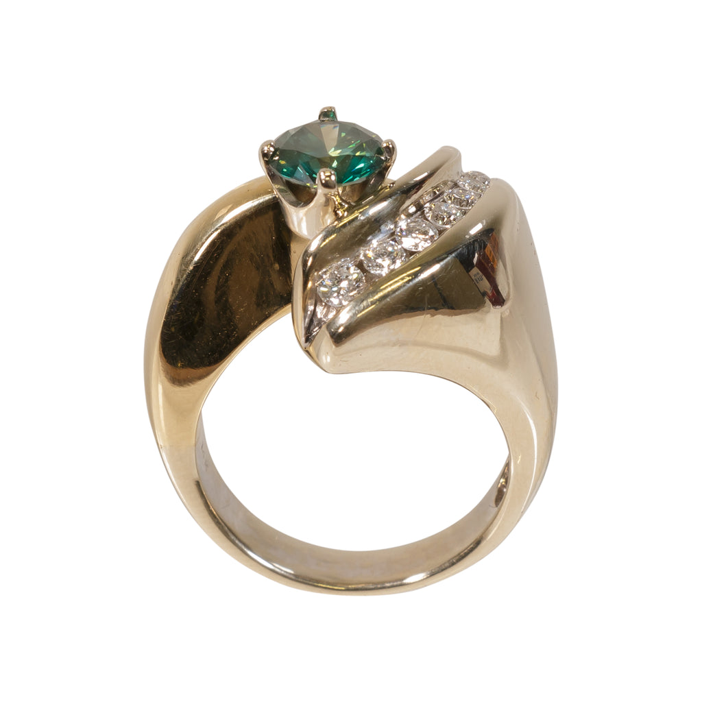 Ladies 14K, two tone yellow and white gold ring. Mounting weights 6.61 DWT and contains seven graduating brilliant cut natural mined diamonds with a total weight of .30ct TW. Clarity grade VS-2, color grade G. Good make and polish. Center diamond is brilliant cut color enhanced green diamond measuring 6.65mm and weighing approximately 1.13ct. Clarity grade VS-2, size 7.75.