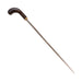 Sword cane with carved mahogany curved handle, brass collar with push pull mechanism that reveals a two sided 17 1/2" blade and brass ferrule. 2 3/4" x 4", blade 17 1/2", overall 35"L