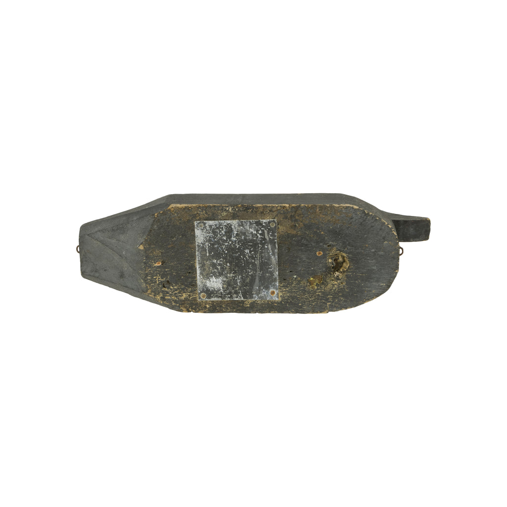 Primitive black duck decoy by Taylor Harwich, Mass, Circa 1880. A gunning decoy with shot holes. Staples on front and back, so was part of a rig. 16"L