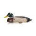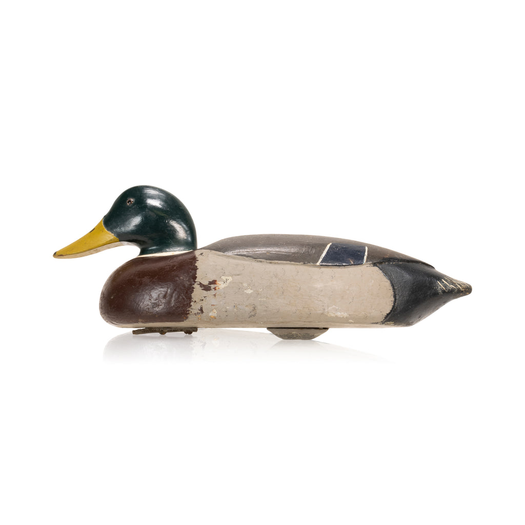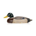 Rig of ten mallard decoys. Three hens, six drakes (sam ratio as factory). Hand carved of balsa wood. Old hunter repaint. Large, flat bodies for big water. Glass eyes.