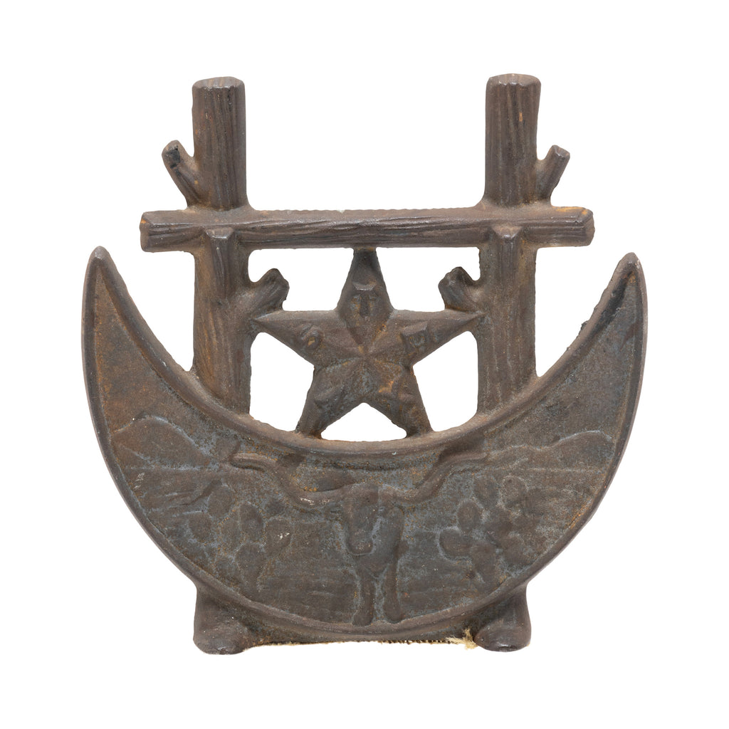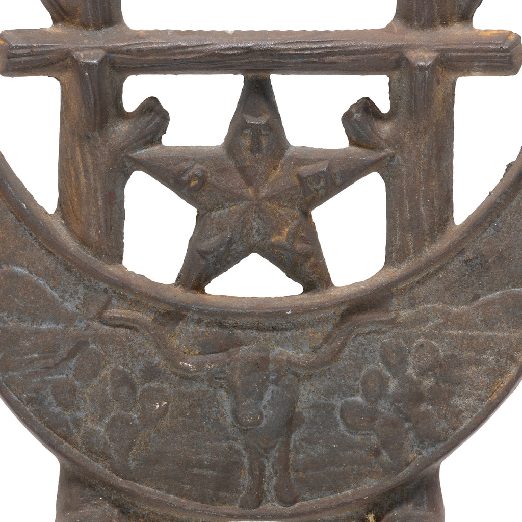 Texas Centennial (1936) iron boot scraper featuring longhorn, cactus and Texas Lone Star. Ex. San Antonio Texas Property. 10 1/2"H x 10 1/4"W x 2 1/2"D