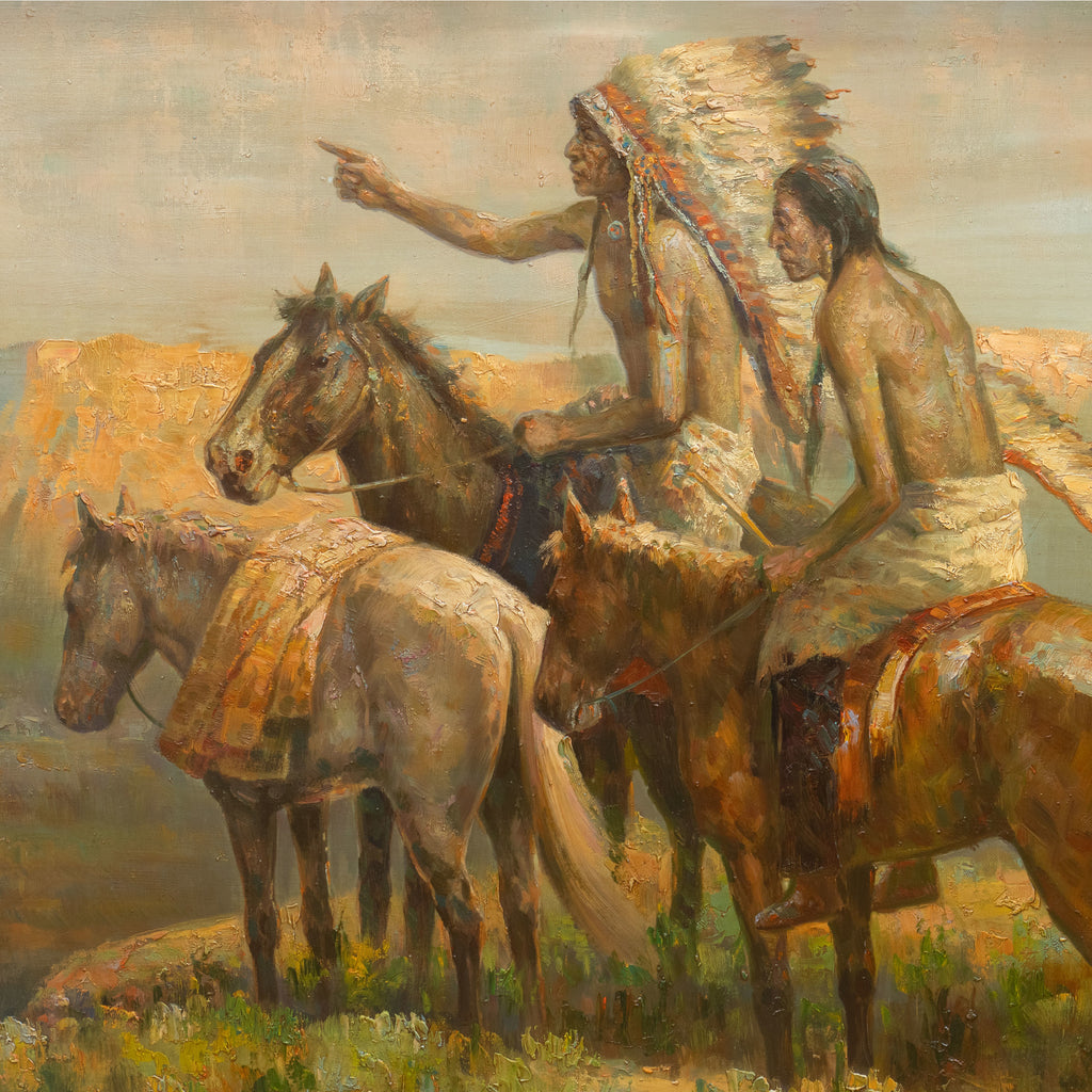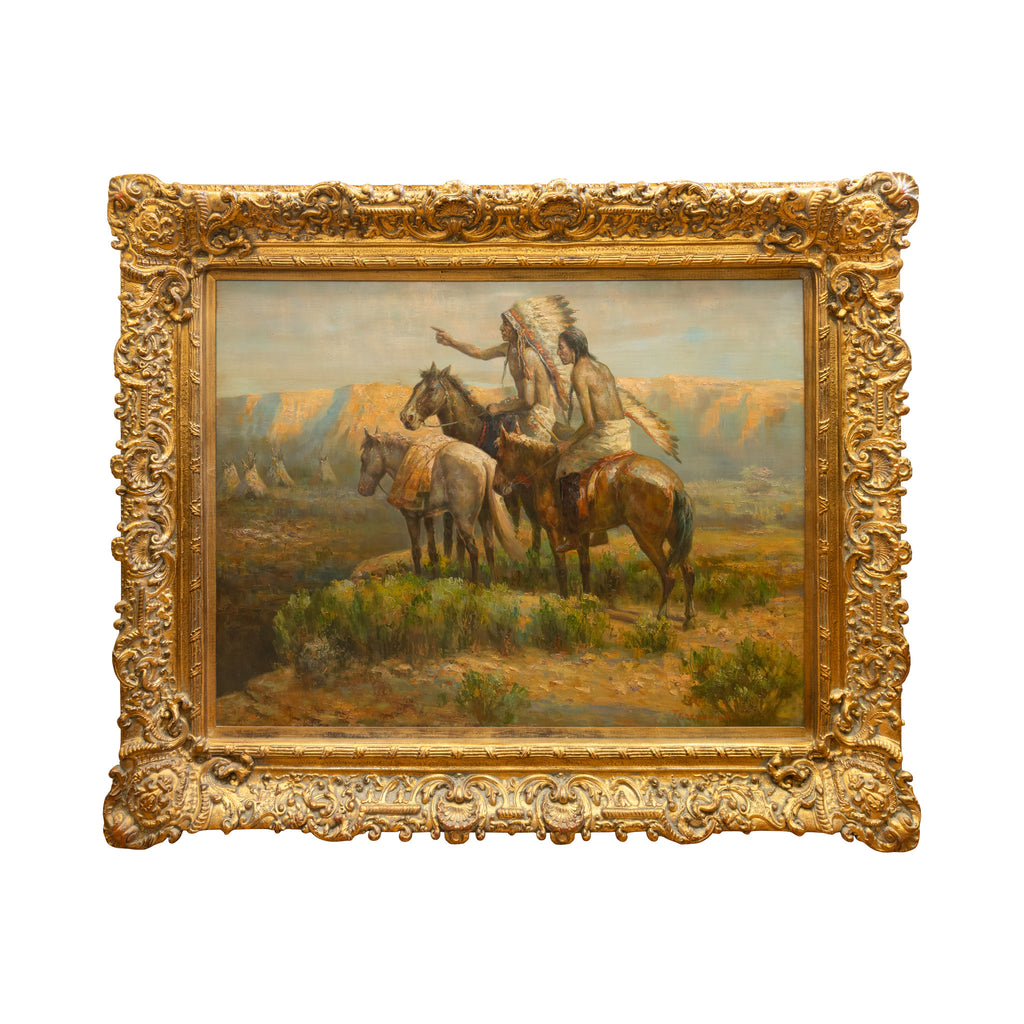 (1949 - ) Oil on canvas; 36" x 48". Two warriors on high ridge overlooking village. Impressive gilted frame.