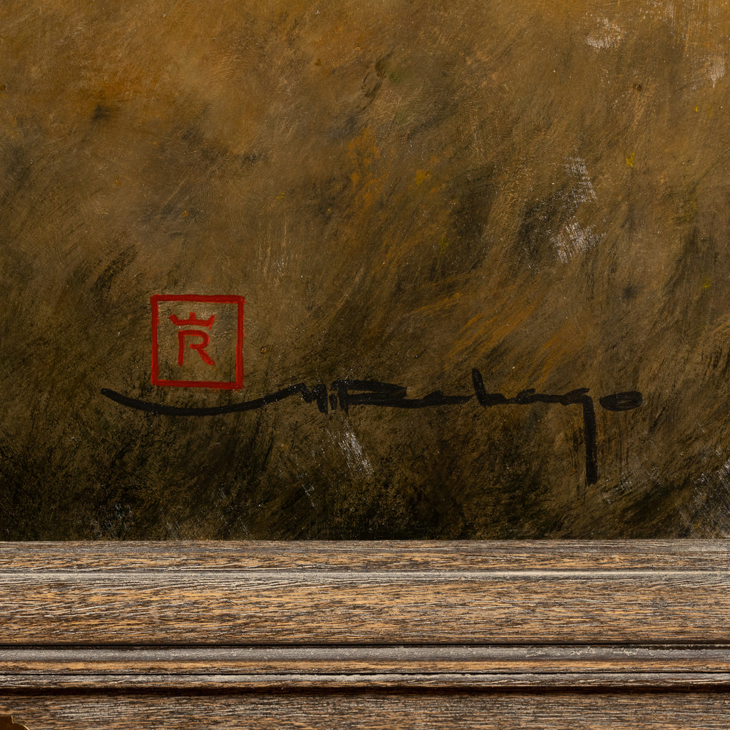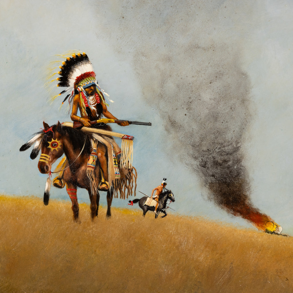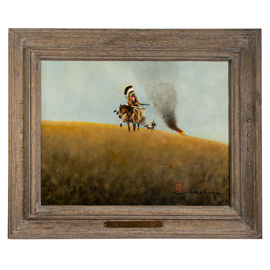 Nez Perce artist. Acrylic on board 20"x 26". Bio available. Framed. Mario Rabago - Self taught, he lived on the Nez Perce Reservation at Lapawai, Idaho most of his life. He learned the stories of the Nez Perce direct from the "old men" at the sweat house, "the Nez Perce are my best friends. . .The only thing I paint are Indians and historical events always related to the US Army and the Indians which I know very well and try to be accurate. If I had to choose somebody who influenced me, I'd have to say Ace Powell. Although I use acrylics for my backgrounds which are simple because I like to go directly to the subject…"