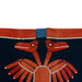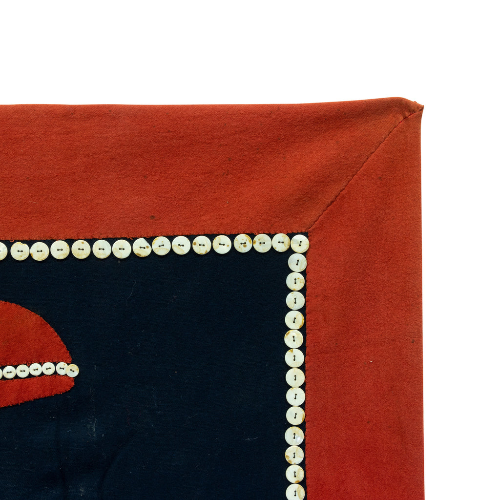 Highly visual Northwest Coast Tlingit dance cape of red and blue stroud with mother of pearl buttons. A dance piece that was used. 55" x 88".