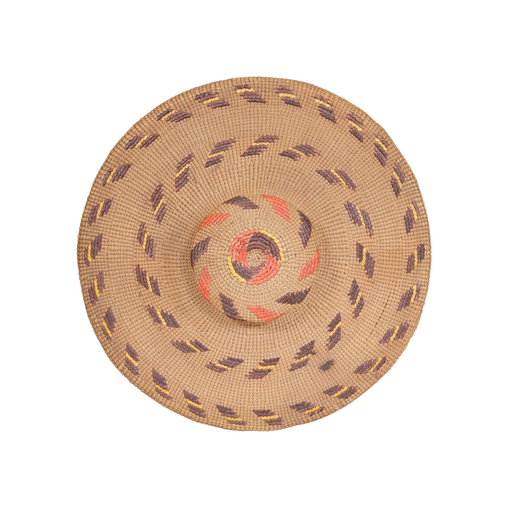 Bright colored Tlingit lidded rattle top basket. Exceptional condition. One small stain not distracting.